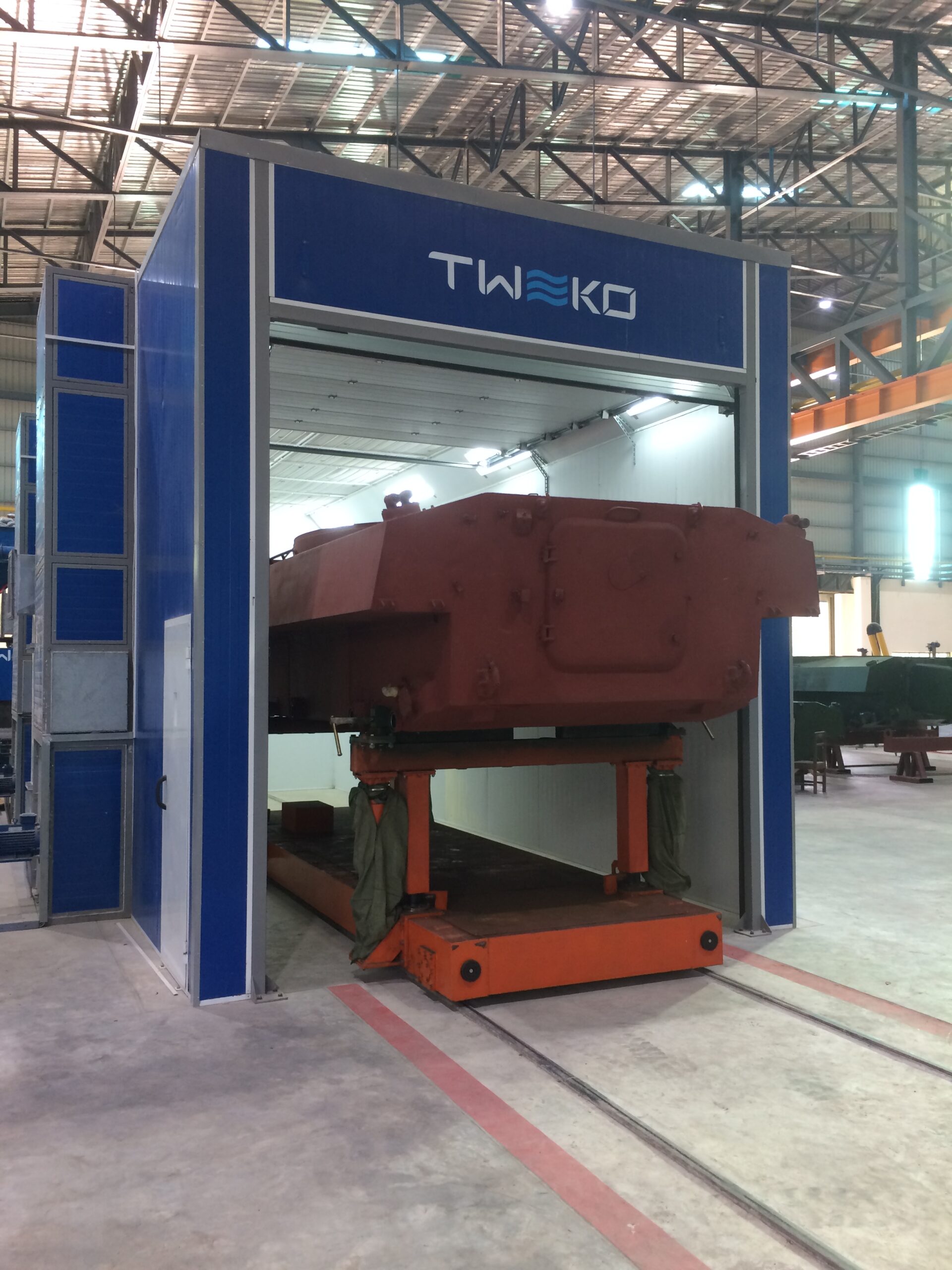 RTK je jednoduché a spolehlivé řešení pro dopravu dílů do průmyslových lakovacích, sušících a abrazivních tryskacích komor. Všechny elektrické instalace jsou umístěny mimo prostory s výbušným nebo požárně nebezpečným prostředím, což umožňuje použití vozíku v prostorech kategorie „A“. Ovládání probíhá pomocí bezdrátového dálkového ovladače s dosahem 100 metrů, doplněného záložním stacionárním tlačítkovým panelem namontovaným v řídicí skříni. Standardní rozchod koleje je 1520 mm, avšak lze jej přizpůsobit v uvedeném rozmezí.