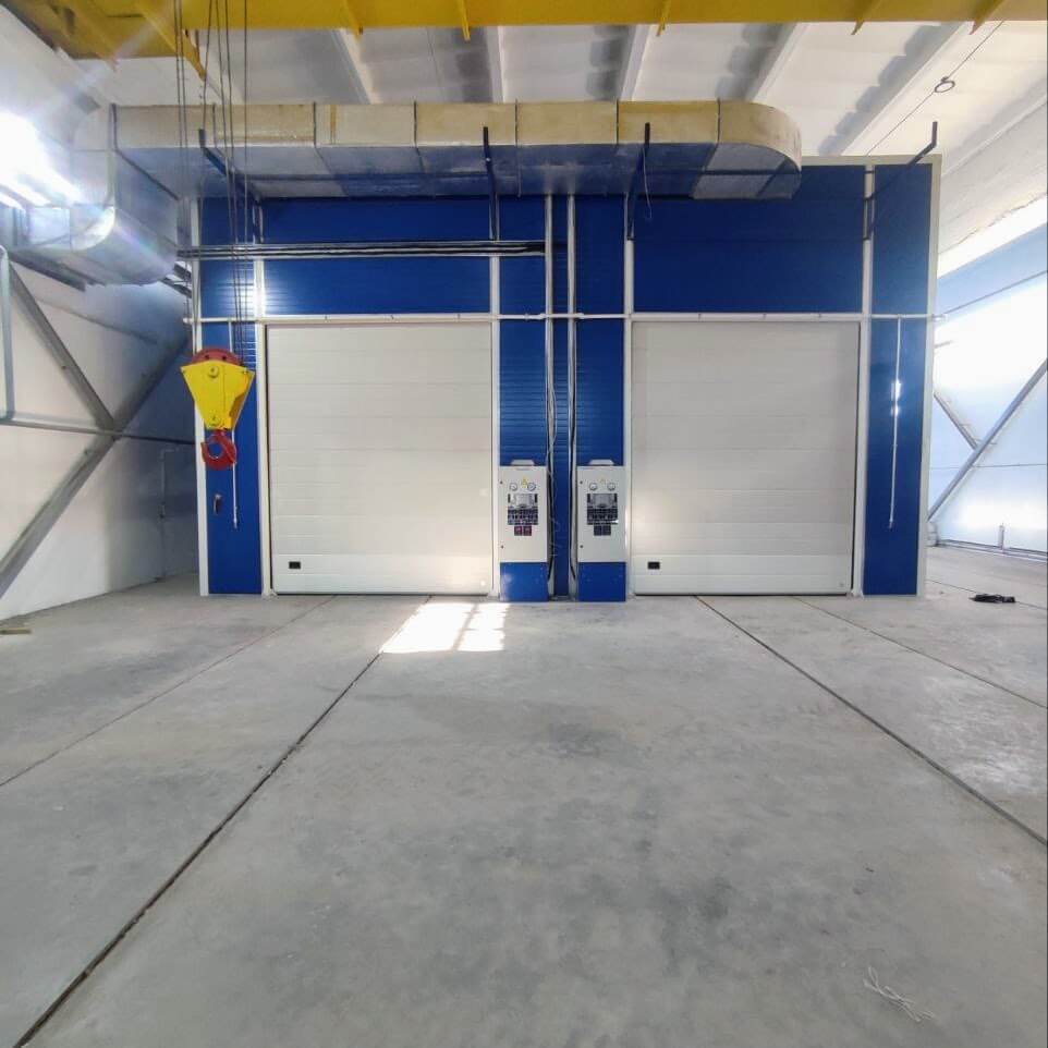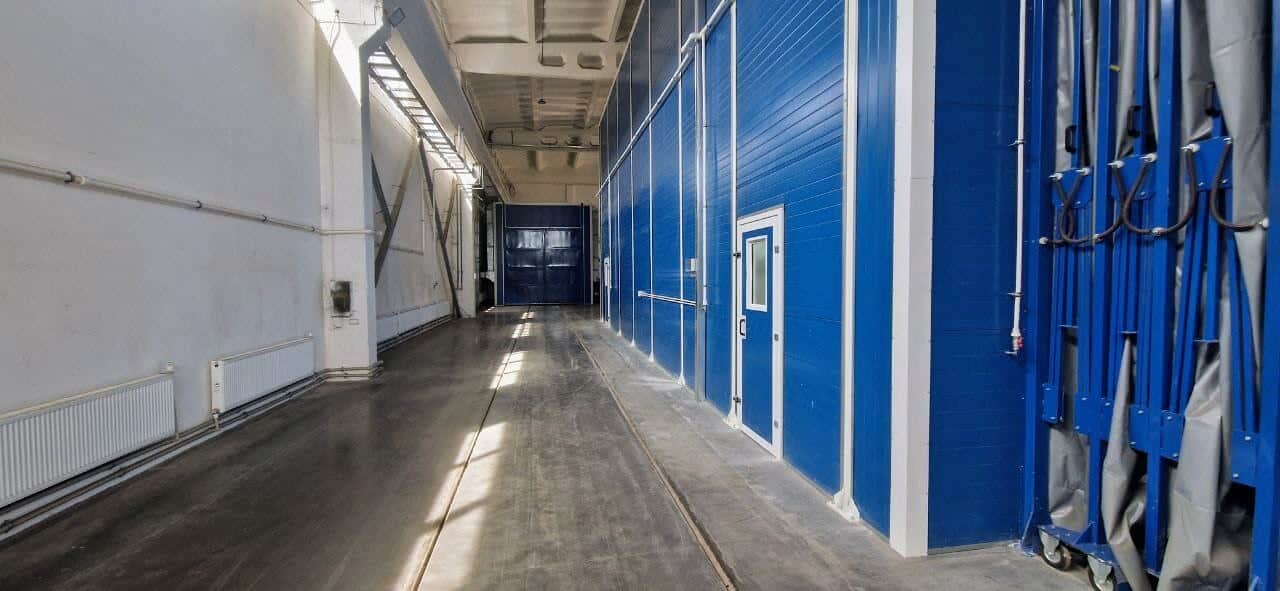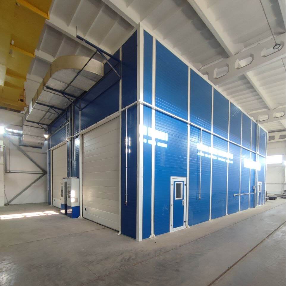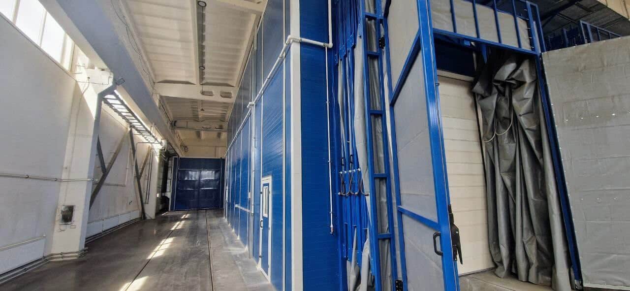 | Pracovní kabiny | Komplex zahrnuje tryskací komoru KASO-15 (vnitřní rozměry 15 000 × 5 000 × 5 000 mm), dvě lakovací a sušicí kabiny IKFS-15 (15 000 × 5 500 × 6 000 mm) a dvě přípravné stanice APP (7 000 × 4 000 × 5 000 mm). Kabiny z sendvičových panelů 80/60 mm. Vnitřní obvod KASO s otěruvzdorným povlakem. Konstrukce APP — kovový rám s vodicími lištami a závěsy. |