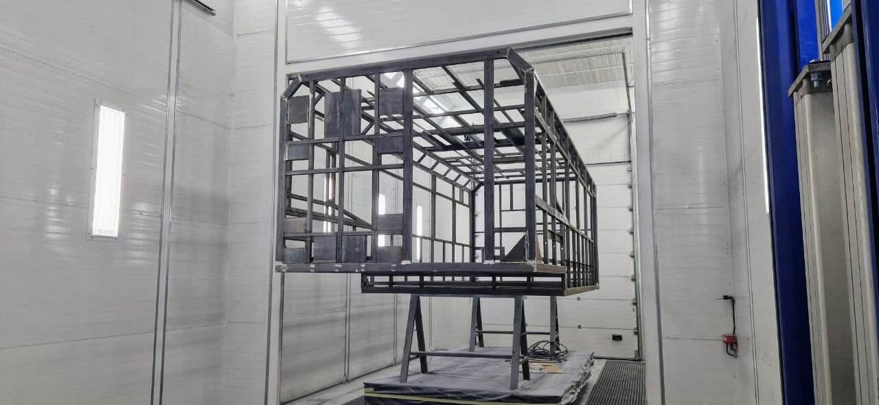 Výrobní proces zahrnuje výrobu složitých kovových konstrukcí nástaveb pomocí svařování, montáže a obrábění, následnou antikorozní úpravu a nanášení vysoce kvalitních lakových povlaků. Některé výrobky dosahují délky až 15 metrů, což klade vysoké nároky na kvalitu tryskání, rovnoměrnost nanášení materiálů, stabilitu proudění vzduchu v lakovacích kabinách a přesnost teplotních režimů sušení.