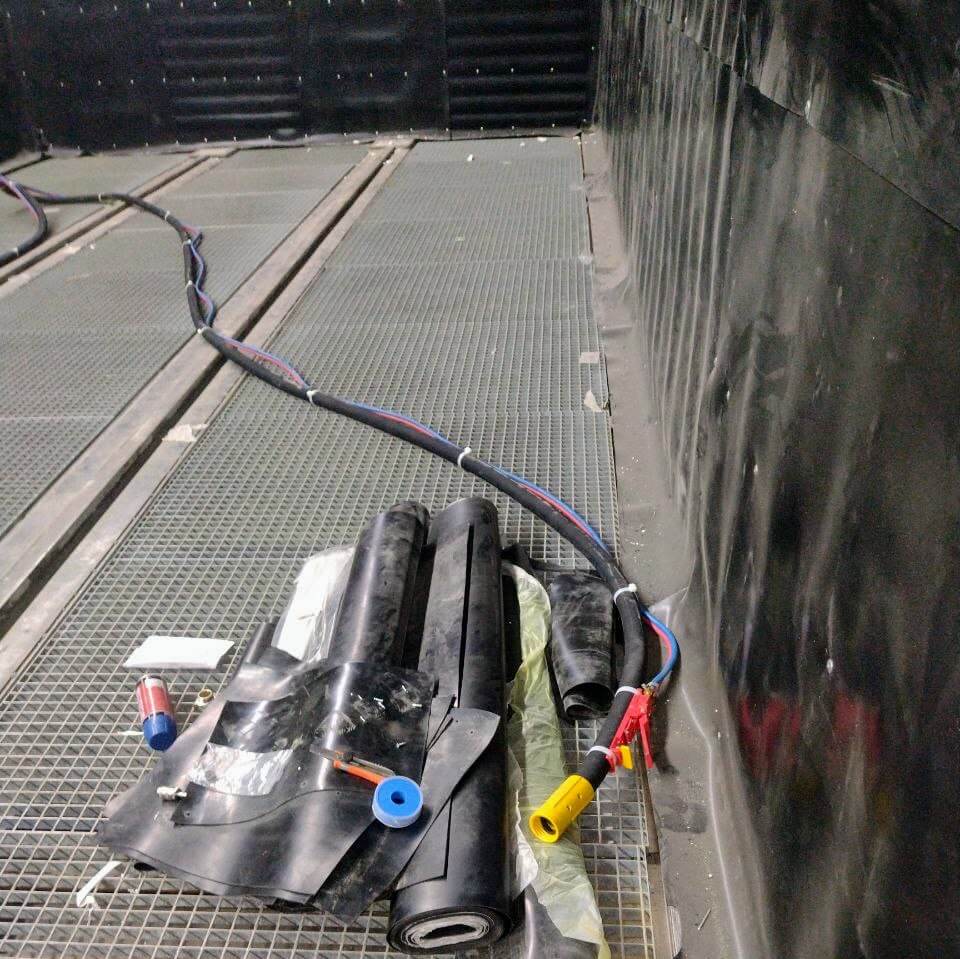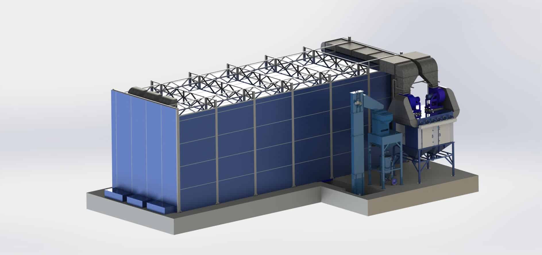 Vnitřní rozměry pracovní zóny: 15 000 × 5 000 × 5 000 mm. Konstrukce z sendvičových panelů tl. 80 a 60 mm. Zóny abrazivního nárazu opatřeny vnitřním otěruvzdorným obložením.