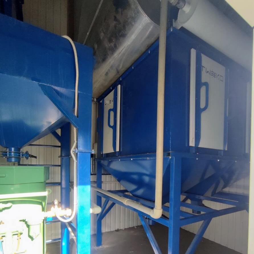 Odsávání prachu během tryskání zajišťuje filtračně-větrací jednotka FVU-30 s ohýbaným pláštěm, patronovými filtry, pulzní regenerací filtrů a sběrným košem na prach.