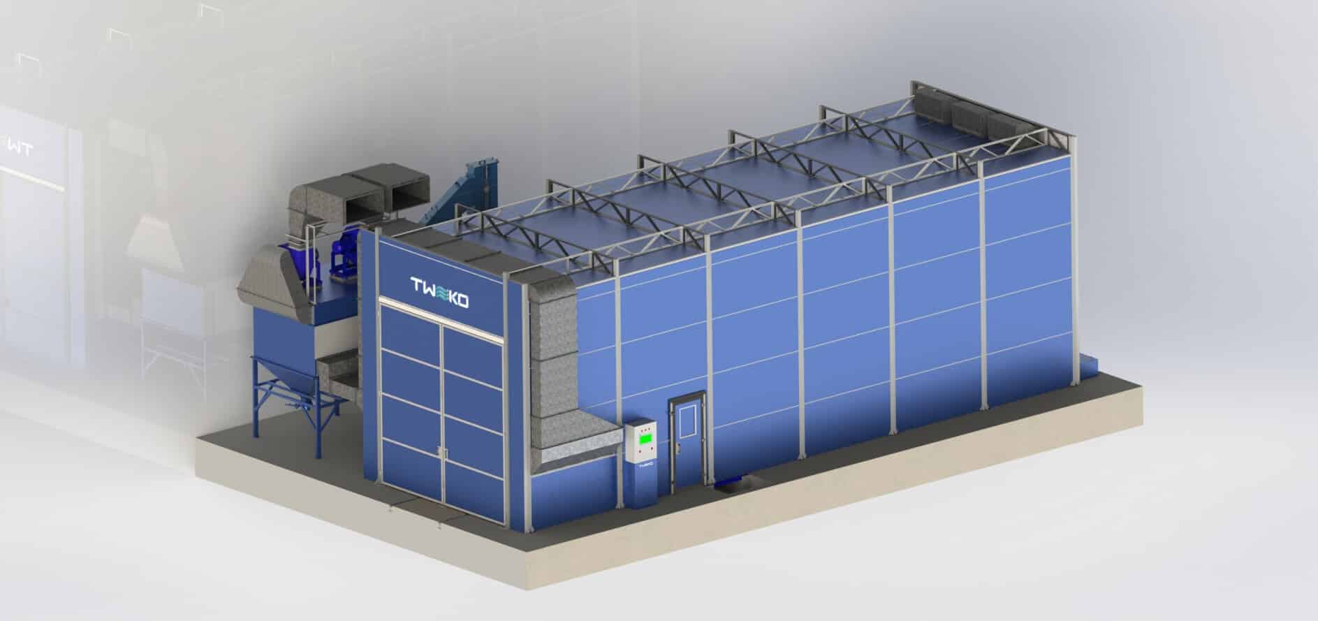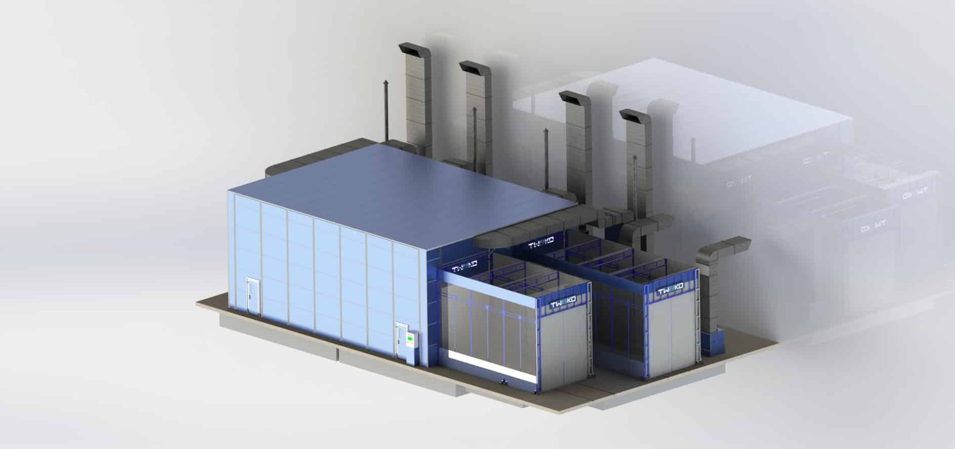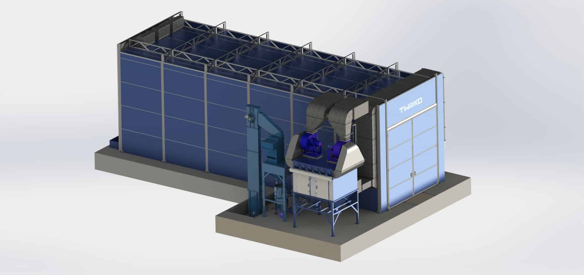 Konfigurace komory je přizpůsobena integraci do stávající výrobní infrastruktury a dimenzována pro intenzivní průmyslový provoz.