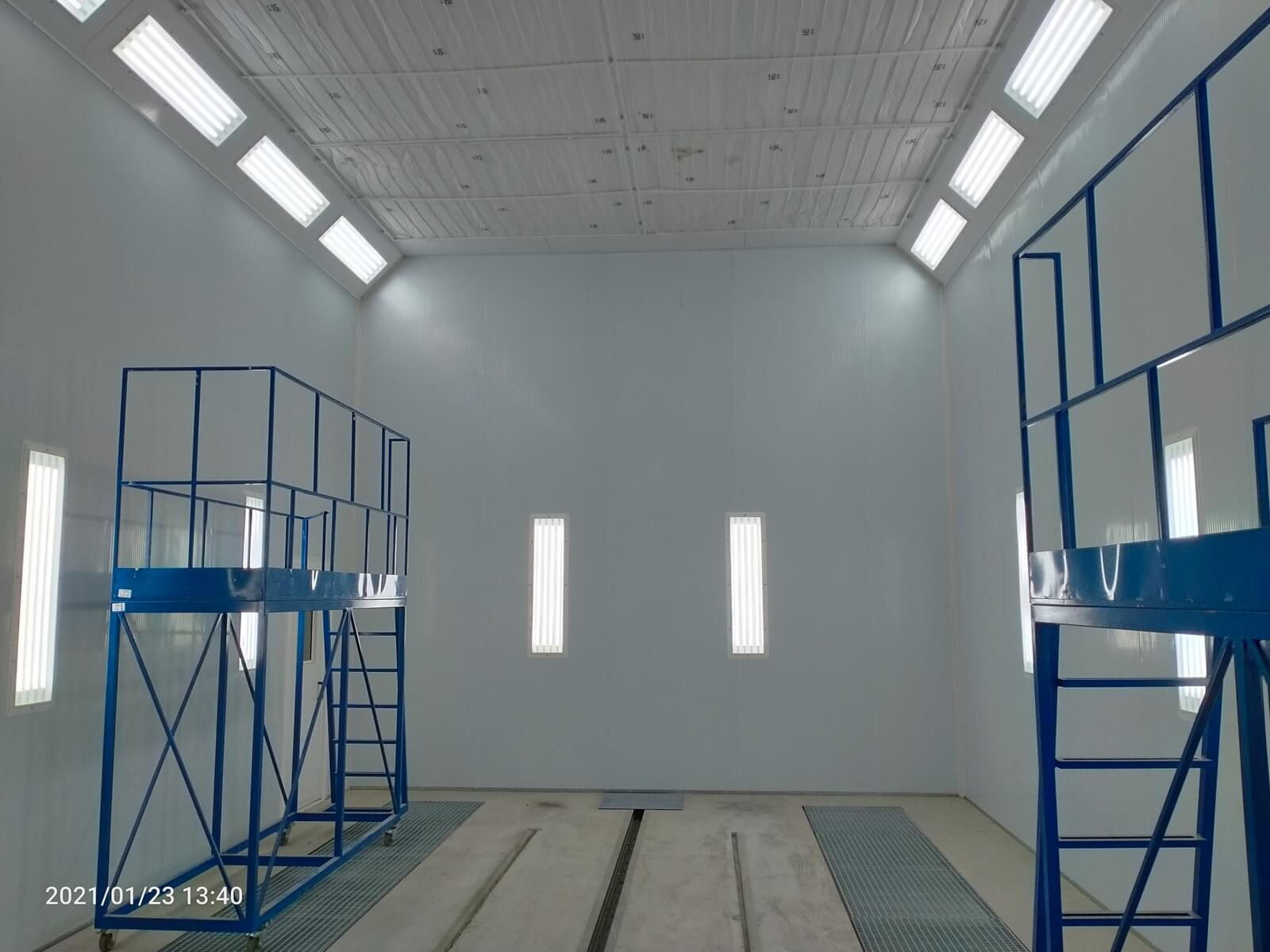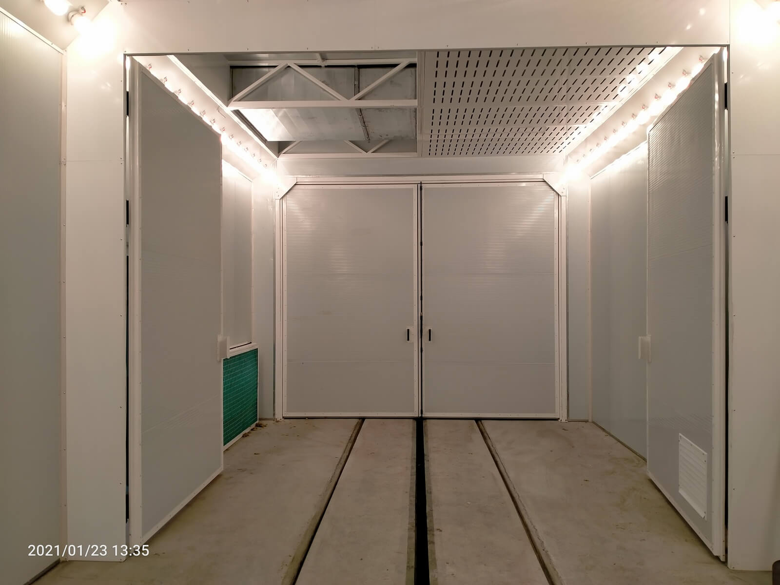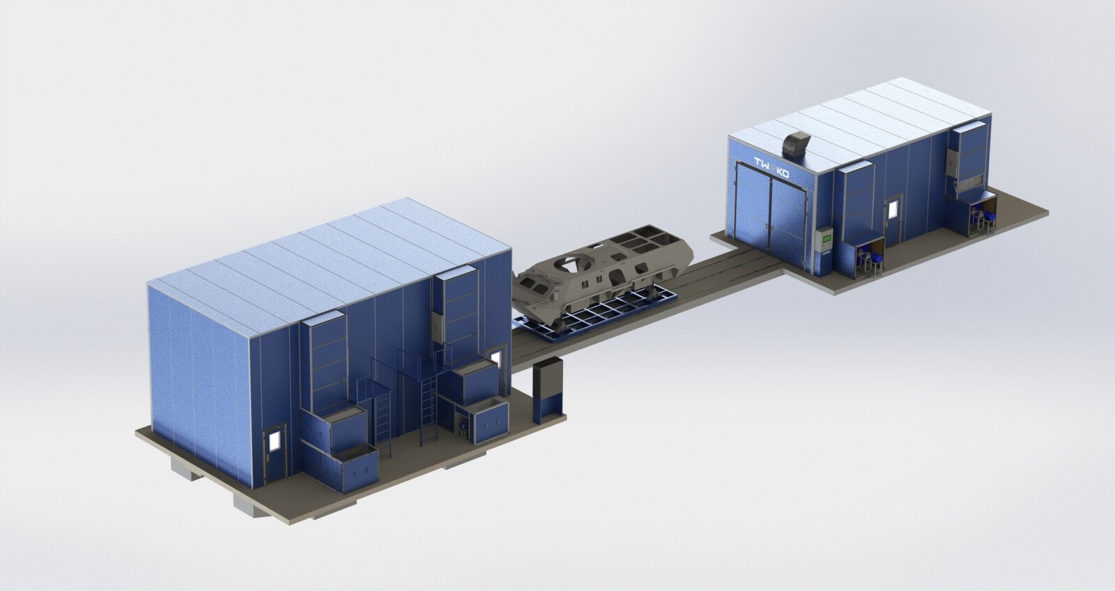 - Lakovací a sušící komora s rozměry (D × Š × V) — 11160 × 5660 × 5540 mm.