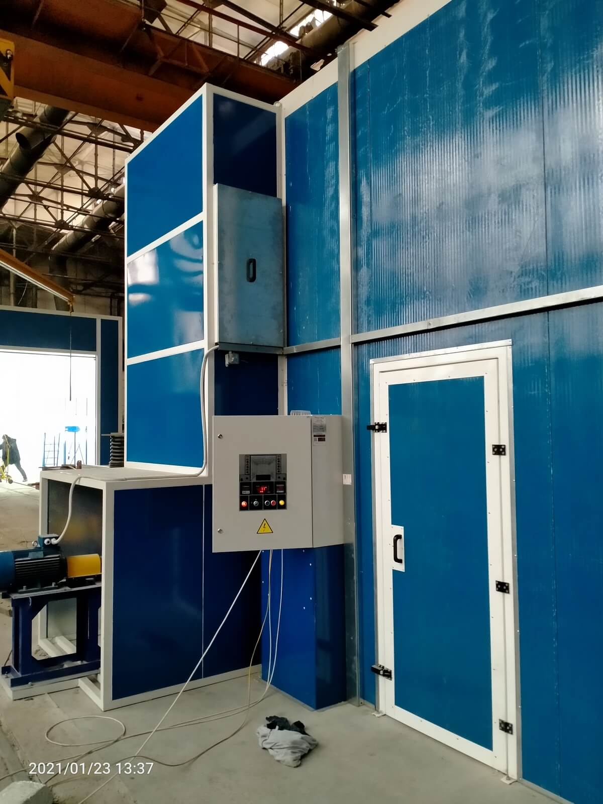 - Sušící komora s rozměry (D × Š × V) — 9240 × 4740 × 4075 mm, teplota sušení až 150 °C, ohřev elektrickými výměníky tepla.