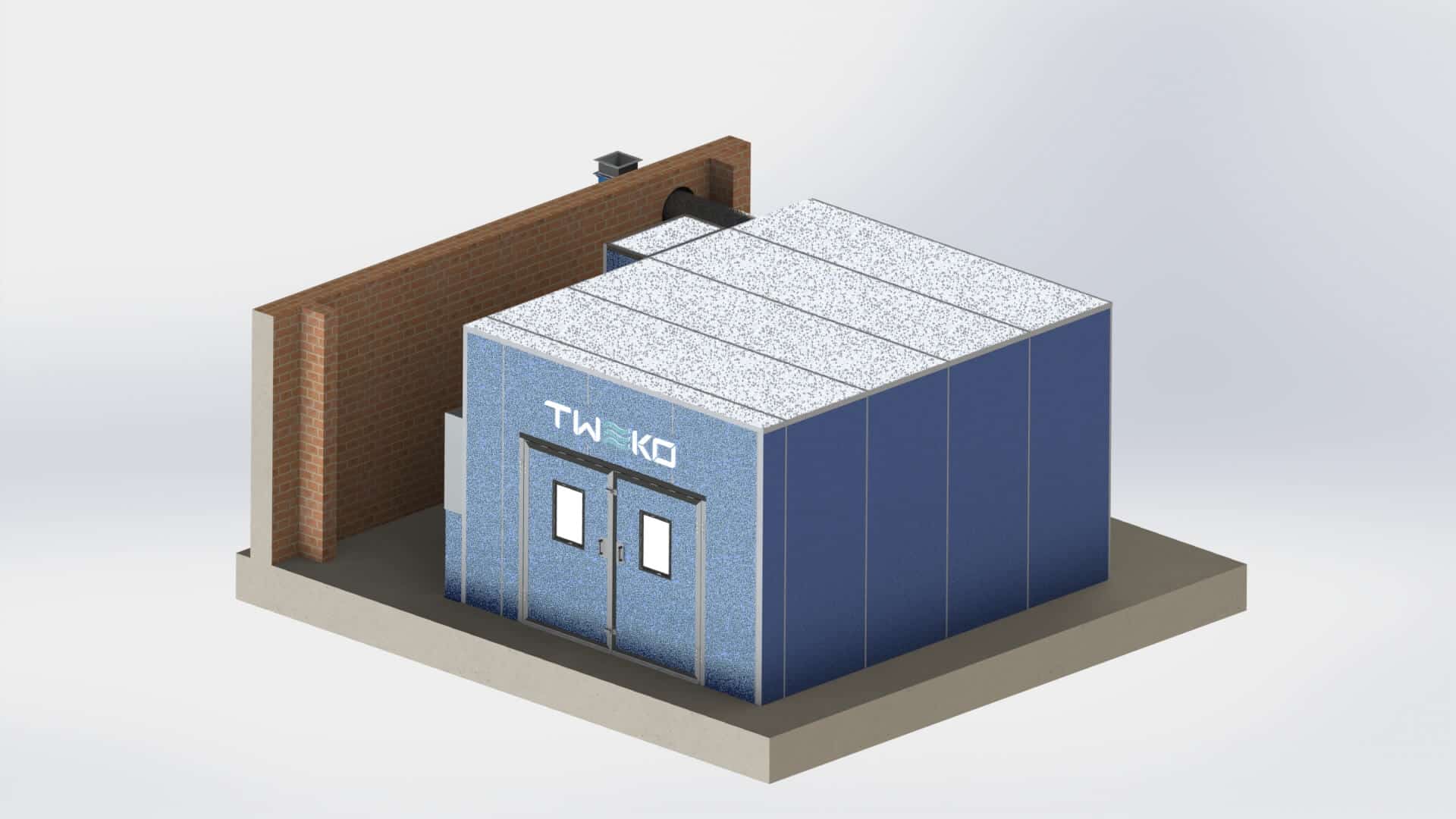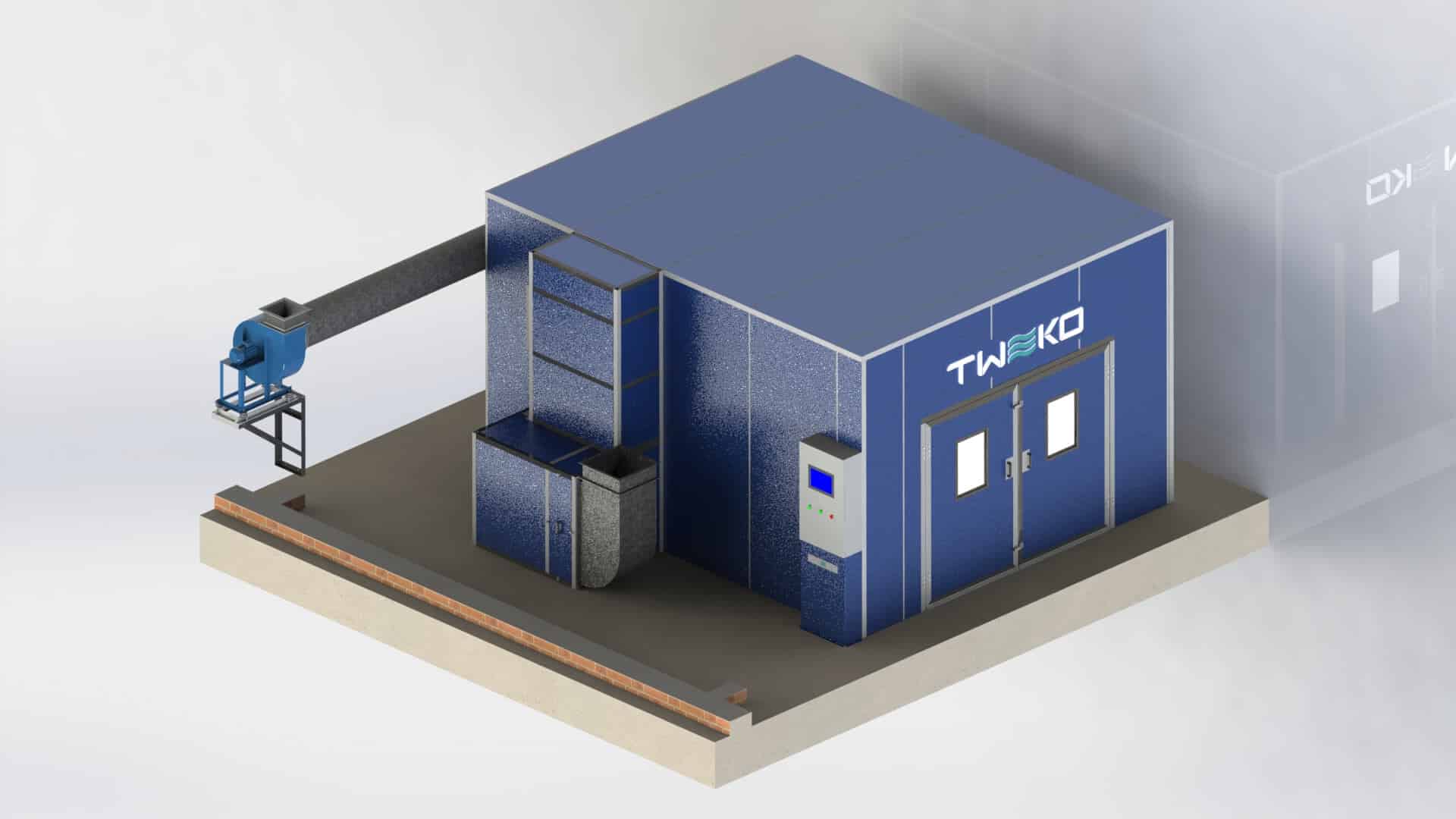 - Montážní práce. TWEKO provedla demontáž starého vybavení, integraci kabiny do komunikací (napájení 380 V/50 Hz, 20–30 kW, z toho 10 kW na motory a osvětlení, 10–20 kW na výměník tepla), vyvedení vzduchovodu oknem a uvedení do provozu.