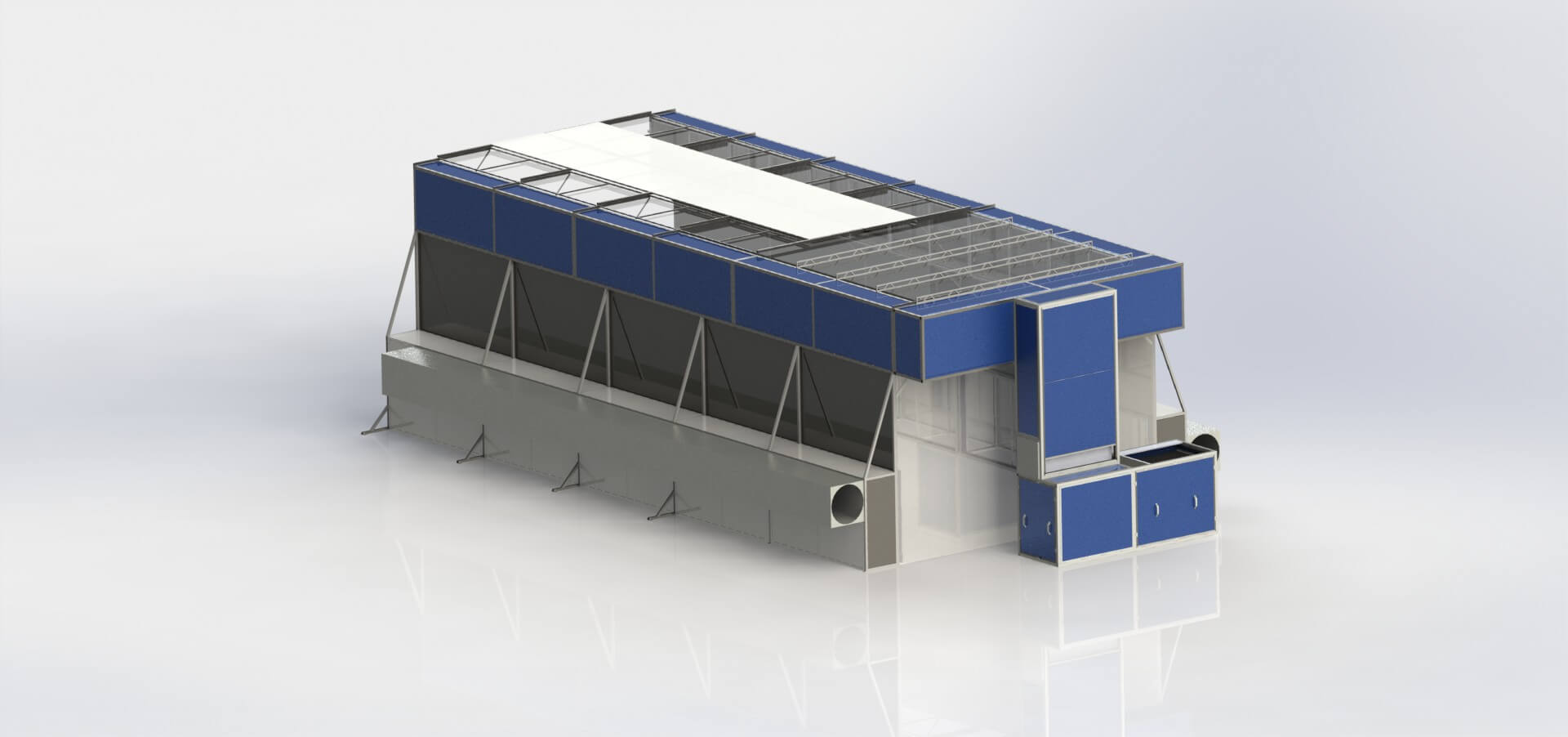 - Odsávací a přívodní systém. V zadní části je umístěna termoventilační skříň, která přivádí vyčištěný a ohřátý vzduch přes výměník tepla do izolovaných přívodních kanálů obložených sendvičovými panely. Odsávací ventilační jednotky jsou namontovány na koncích odsávacích skříní.