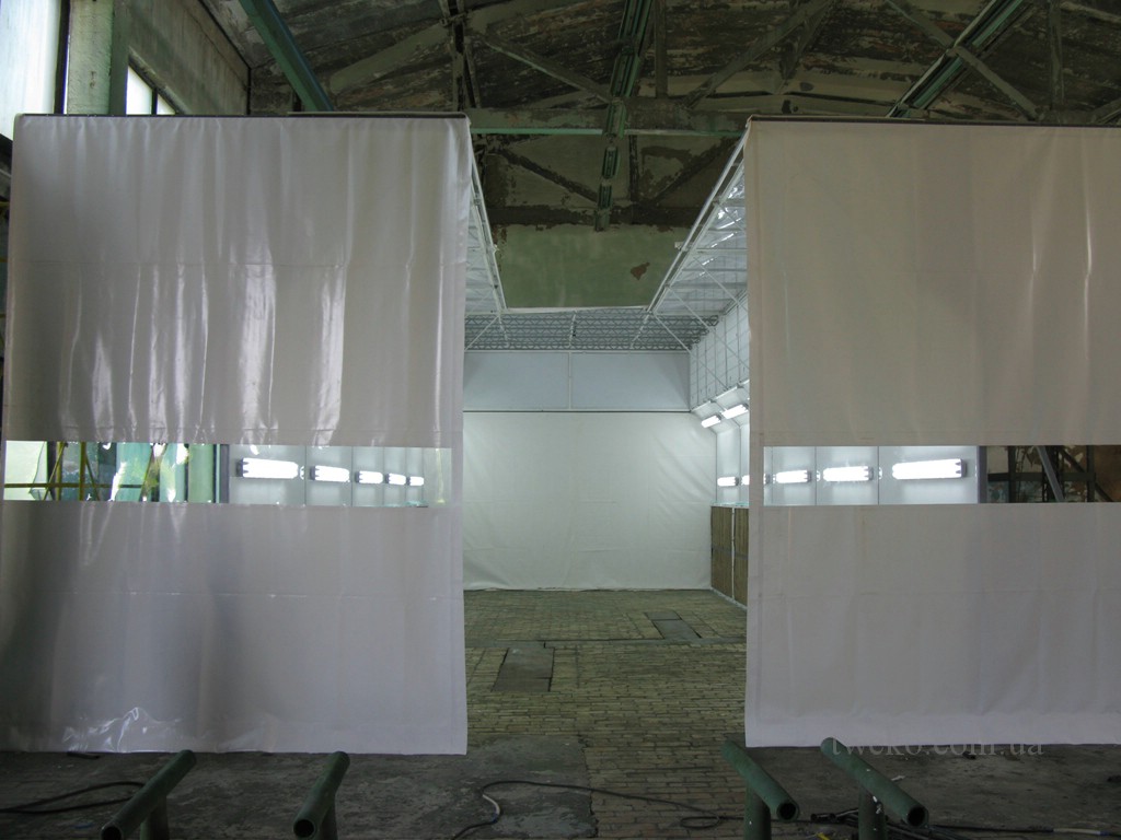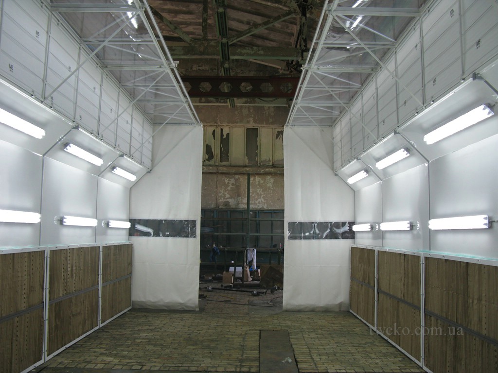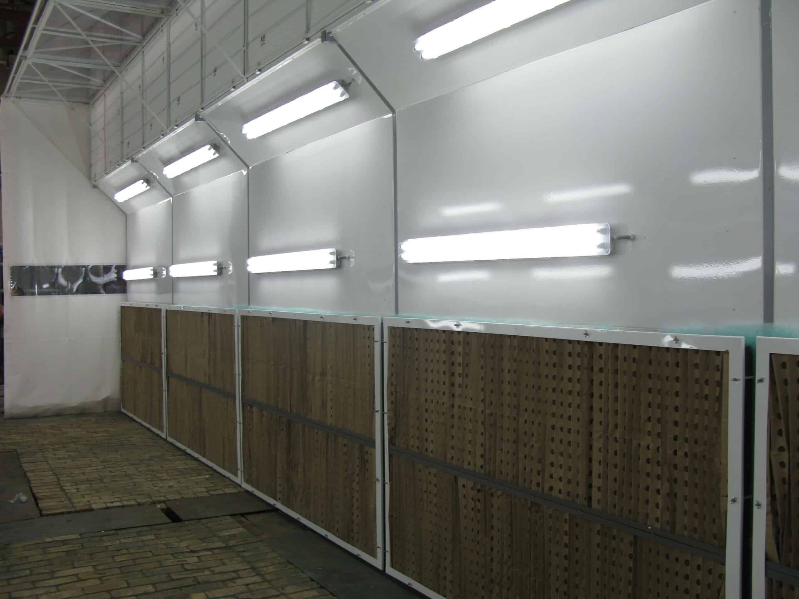 - Lakovací zóna. Kabina o rozměrech 14×5×5 m (vnitřní zóna 11 990×4 800×3 000 mm) je vybavena dvěma odsávacími skříněmi (2 350×650×1 500 mm) na obou stranách, s dvoustupňovou filtrací: kartonový labyrintový filtr a syntetický skleněný filtr pro efektivní čištění vzduchu.