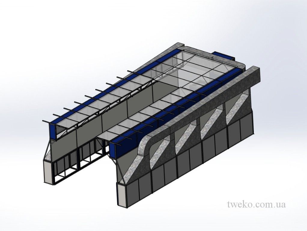 - Konstrukce. Prostor mezi odsávacími skříněmi a přívodními kanály je obložen ohýbanými panely s bílým polymerním povlakem. Kabina je instalována na 12 podpěrách vyrobených zákazníkem podle výkresů TWEKO (ASH-KF.01.90.000 SB).