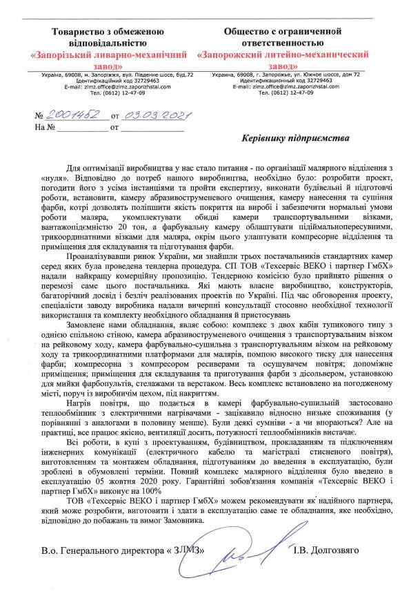 Malířská část Zaporizhzhia Livarno-Mechanického Zavodu V roce 2018 obdržel oddělení prodeje naší společnosti požadavek na lakovací kabina a komoru pro abrazivní čištění od zástupců společnosti TOV “ZLMZ”. Během jednoletých jednání jsme společně s ZLMZ vytvořili technický úkol a podrobný plán pro výstavbu malířského oddělení jako celku. Pro realizaci tohoto projektu bylo nejprve nutné provést práce na návrhu nové malířské části na podniku, schválit projekt s místními úřady, provést hodnocení vlivu na životní prostředí a přitom dodržovat nejpřísnější pravidla týkající se bezpečnosti práce a požární ochrany.