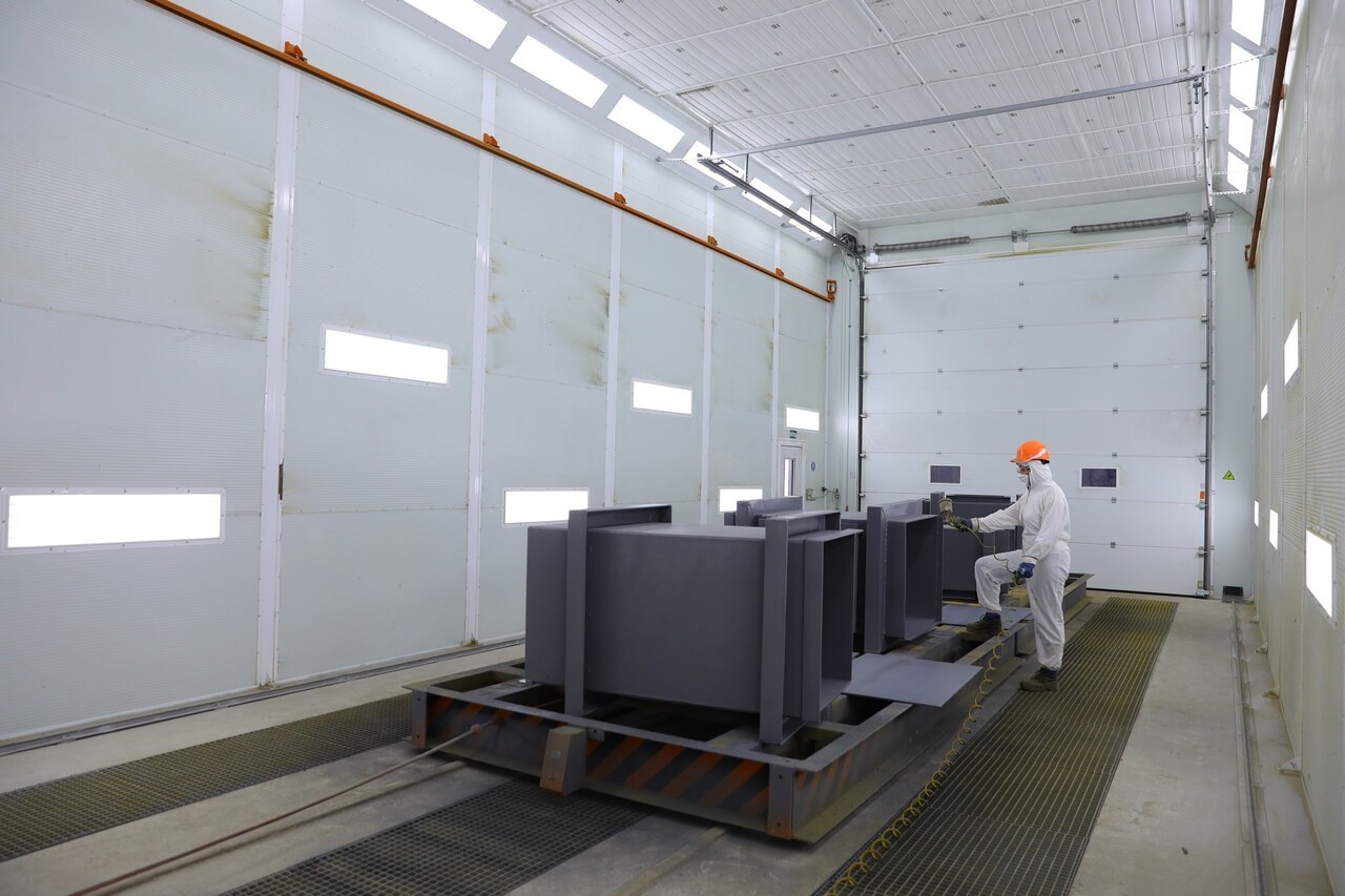 Lakovací a sušicí box a kabiny pro otryskávání abrazivem jsou umístěny mimo hlavní výrobní prostory a jsou k nim připojeny čelní stěnou s vraty. Obě komory mají vnitřní rozměry 16180 x 6000 x 5500 mm a v kombinaci s kolejovými vozíky umožňují efektivní zpracování výrobků s rozměry až 15 x 4 x 5 metrů a hmotností až 20 tun! Obě komory vynikají energetickou účinností, protože jsou hermeticky uzavřené a vyrobeny ze sendvičových panelů s nehořlavou výplní z minerální vlny o tloušťce 100 mm. Lakovací komora má tři řady hermetických energeticky účinných LED svítidel, které zajišťují osvětlení uvnitř kabiny minimálně 800 luxů, což umožňuje optimální nanášení nátěrových hmot na různé typy výrobků.