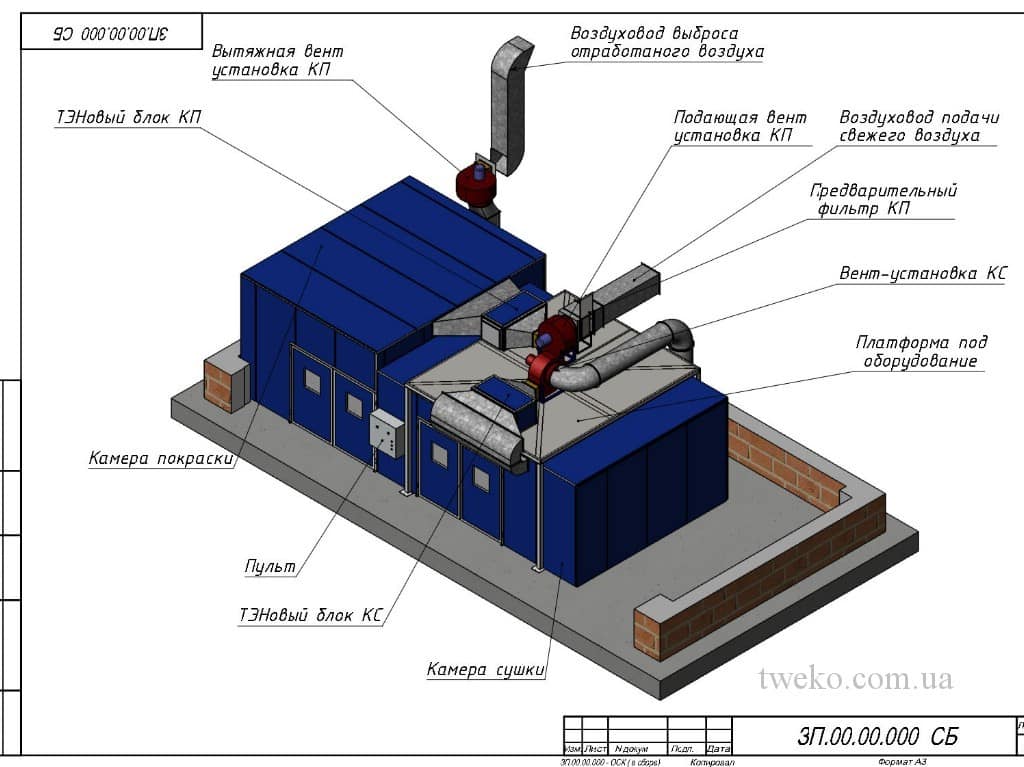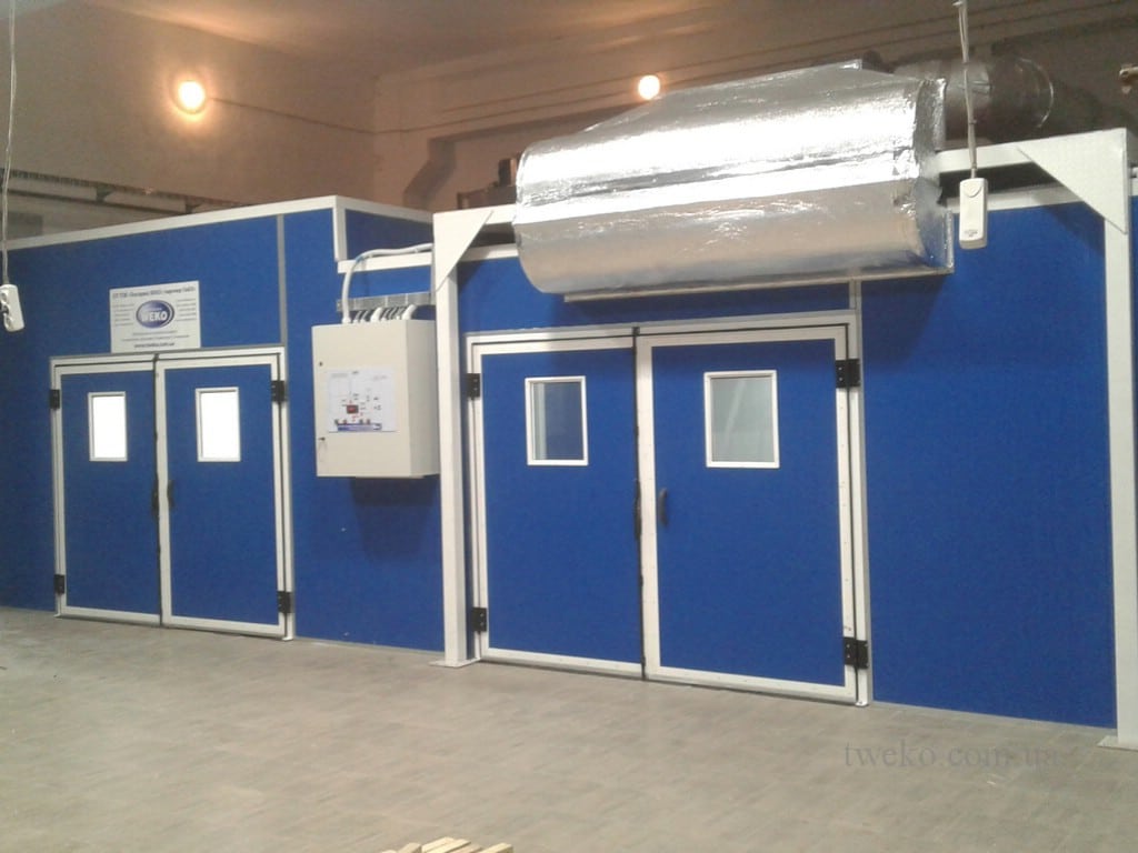 Termoventilační jednotky jsou umístěny na střeše sušící komory, čímž se šetří cenný prostor v dílně. Díky konstrukci s propojenými komorami je výrobek ihned po lakování přesunut do sušící zóny, aniž by opustil čisté prostředí. To minimalizuje vystavení prachu a zaručuje bezchybnou kvalitu nátěru.