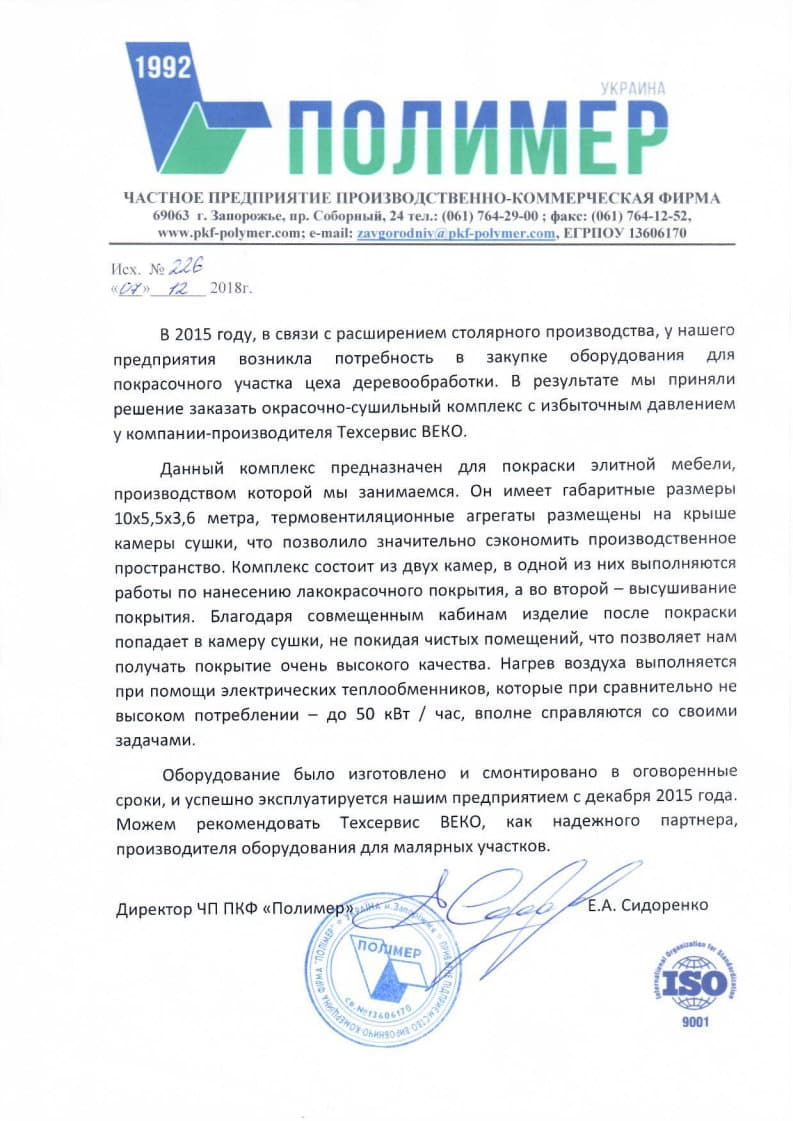 V roce 2015 se společnost Polymer PKF LLC (Záporoží) rozhodla modernizovat svou truhlářskou výrobu rozšířením lakovací části truhlářské dílny. Za tímto účelem si u výrobce, společnosti Techservice VEKO a Partner GmbH LLC, objednala lakovací a sušící komplex s přetlakovým prostředím, určený pro povrchovou úpravu exkluzivního nábytku.