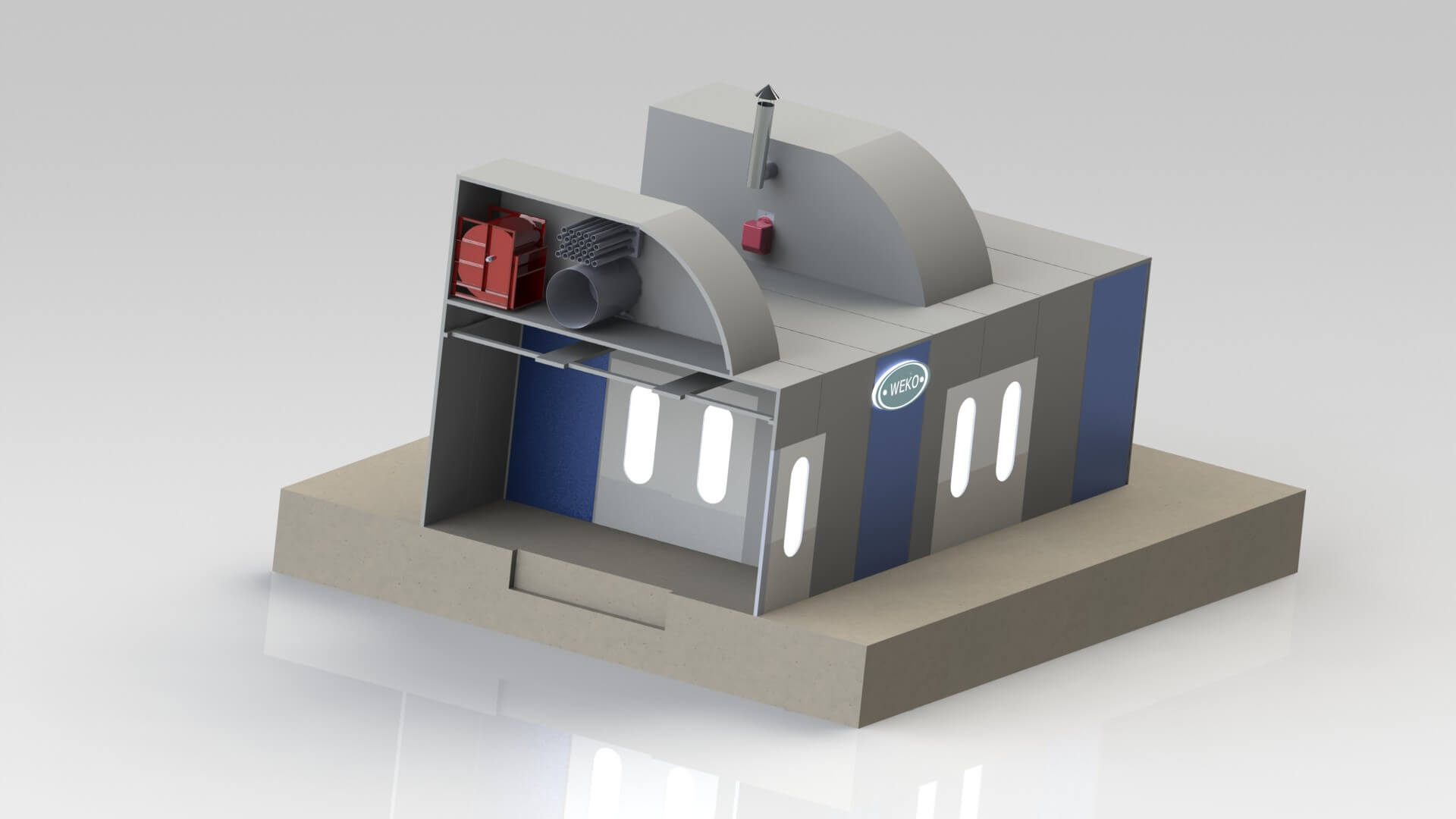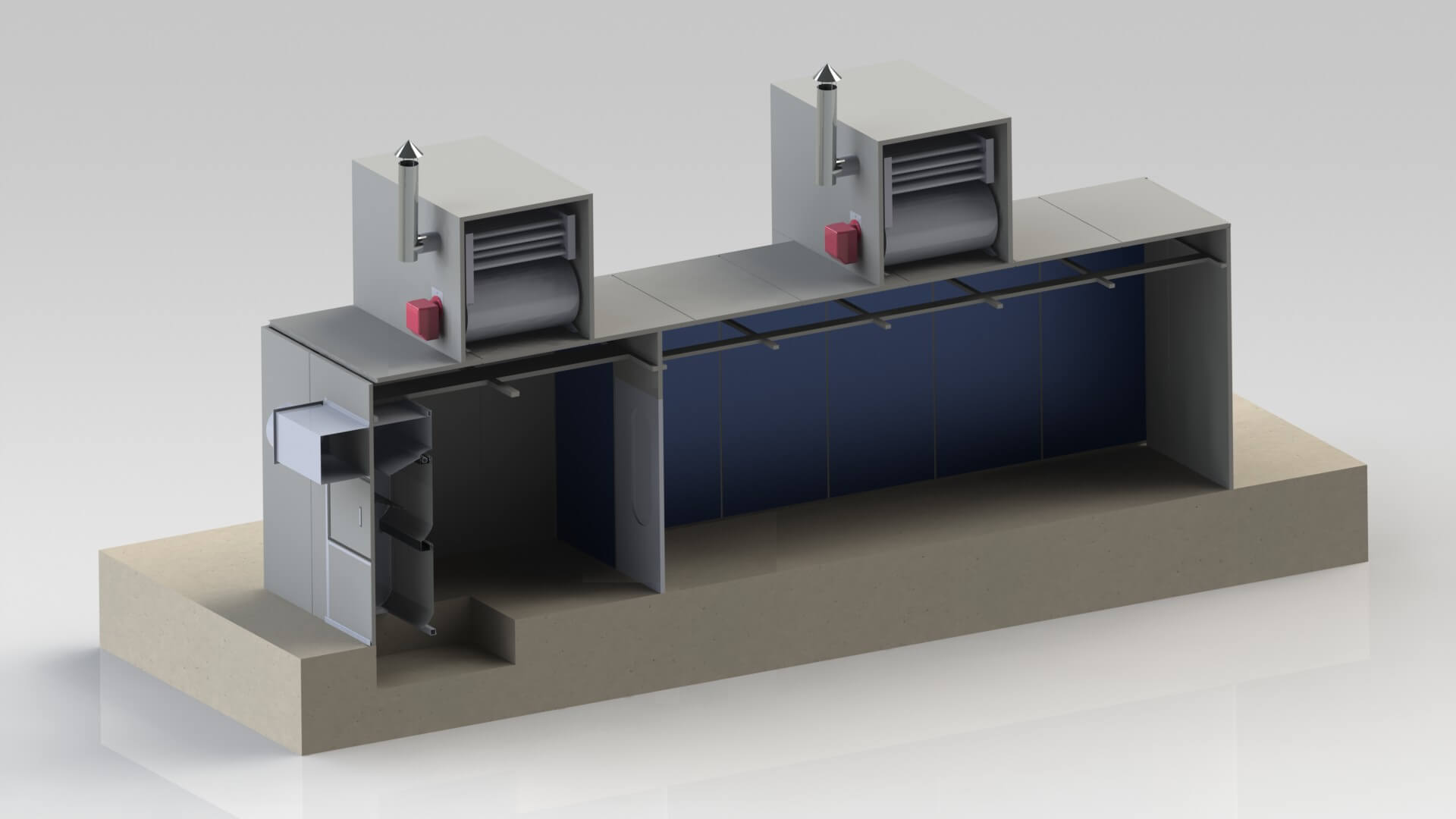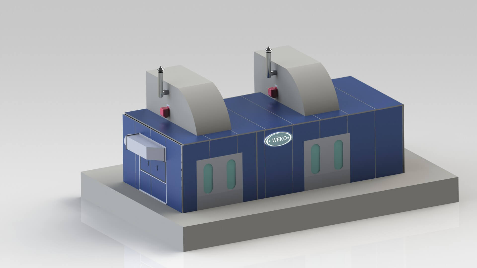 - Termoventilační systém. Nad sušicí komorou jsou umístěny termoventilační skříně (TVC), které vyžadují montážní plošinu s opěrnými farmami. TVC malířské komory zajišťuje přívod vzduchu, odvod je řešen výsuvnou skříní s hydroekránem (o rozměrech 2’350×500×2’000 mm, umístěnou vlevo od vchodu). Sušicí komora pracuje v režimu recyklace s částečnou obnovou vzduchu (do 20 %) pro požární bezpečnost, což šetří energetické zdroje.
