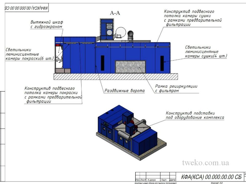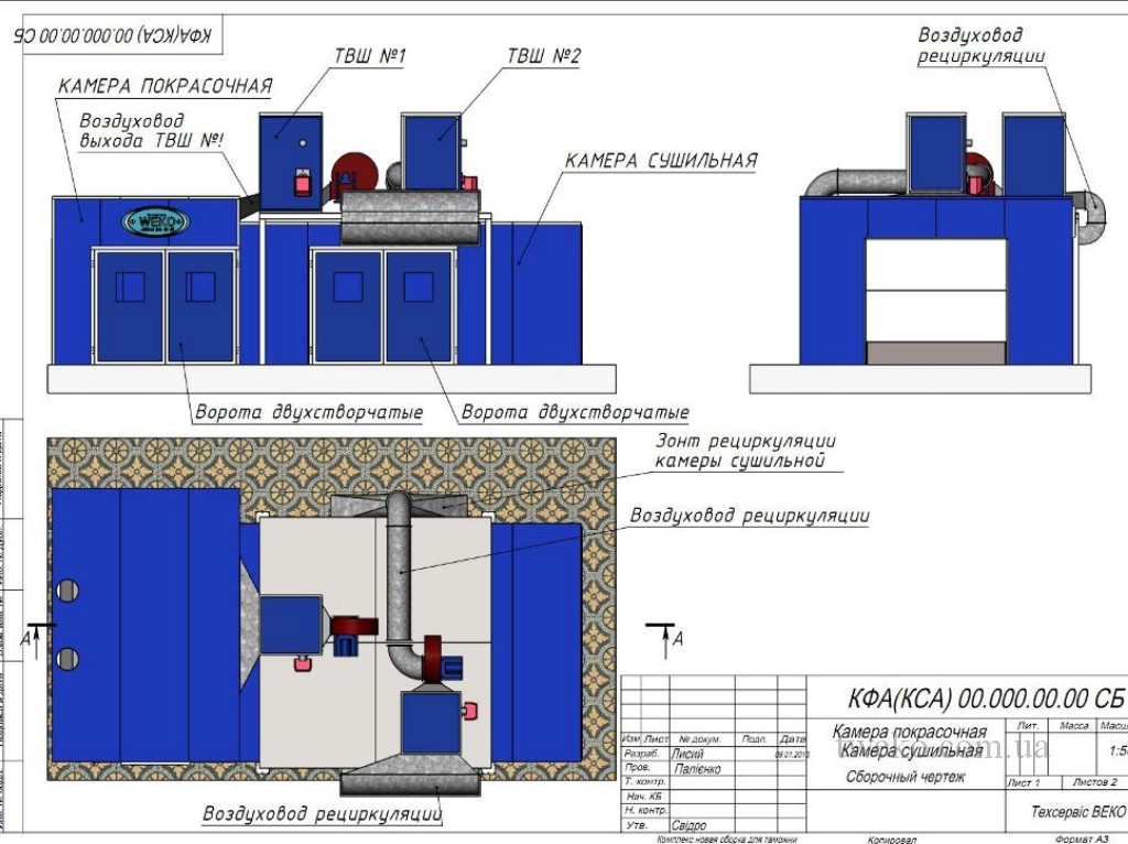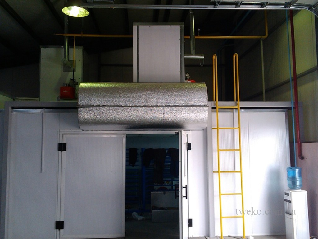 Žádost od LLC „AZ MDF Ltd“ byla předložena v roce 2013, což odráželo potřebu společnosti po moderním řešení pro nanášení a sušení lakovarského nátěru na nábytkové výrobky. TWEKO zahájila práci s podrobnou analýzou výrobních potřeb podniku s ohledem na specifika výroby desek MDF a požadavky na povrchovou úpravu. Na základě této analýzy byl navržen individuální malovací a sušicí komplex s ventilací, skládající se z malířské komory a sušicí komory, každá s vnitřními rozměry 5×4×2,4 m. Zvláštní pozornost byla věnována přizpůsobení ventilačních systémů, včetně výsuvné skříně s hydroekránem (o rozměrech 2’350×500×2’000 mm) pro efektivní odvod vzduchu v zóně malování, a režimům recyklace v sušicí komoře s částečnou obnovou vzduchu (do 20 %) pro úsporu energetických zdrojů. Ohřev vzduchu byl realizován naftovým palivem, což odpovídalo technickým možnostem objednatele. Komplex, integrován do společné kabiny o rozměrech 9’500×4’500×2’200 mm s třemi dveřmi (skládacími 2’000×2’000 mm pro vstup/výstup a posuvnými pro přechod), byl vyroben z sendvičových panelů s bazaltovým výplňovým materiálem (tloušťka 50 mm). Nad sušicí komorou byly instalovány termoventilační skříně (TVC), pro které byla vybudována montážní plošina s opěrnými farmami. Projekt byl dokončen v březnu 2013, což zajistilo včasné uvedení komplexu do provozu a soulad se stanovenými výrobními požadavky.