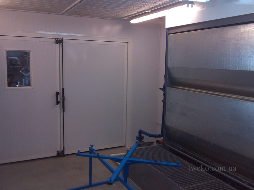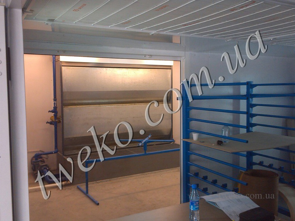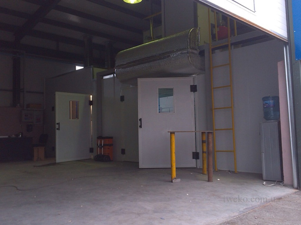 - Malovací a sušicí komplex. Každá komora má vnitřní rozměry 5×4×2,4 m. Komplex je vybaven třemi dveřmi: vstupem do zóny malování, přechodem mezi zónami a výstupem ze sušicí komory. Dveře jsou navrženy jako dvoukřídlé skládací dveře (2’000×2’000 mm) s kontrolním okénkem pro vstup/výstup a posuvné dveře pro přechod. Celková kabina z sendvičových panelů s bazaltovým výplňovým materiálem (tloušťka 50 mm) má rozměry 9’500×4’500×2’200 mm, přičemž zóna malování činí 3’200×4’500×2’200 mm a sušicí komora 6’250×4’000×2’000 mm. Ohřev vzduchu je zajištěn naftovým palivem.