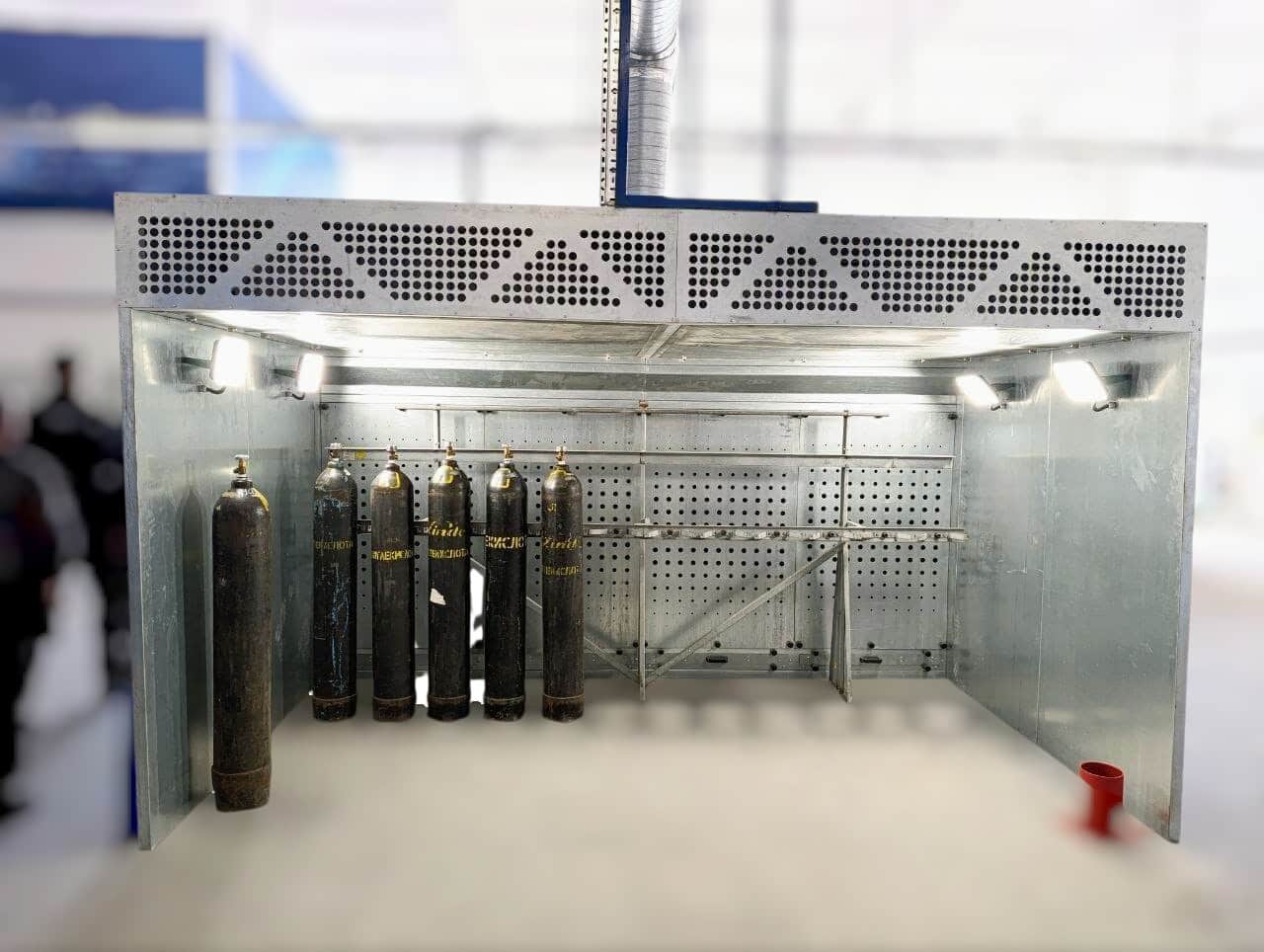 | Lakovací kabina ASS-Cabin-2 | Umožňuje kontrolované lakování tlakových lahví. Dvoustupňová suchá filtrace (kartonový labyrintový filtr + PaintStop, účinnost ≥95 %, třída EU4). Odvod vzduchu potrubím D560 mm na střechu (otvor Ø ≈1,1 m). |