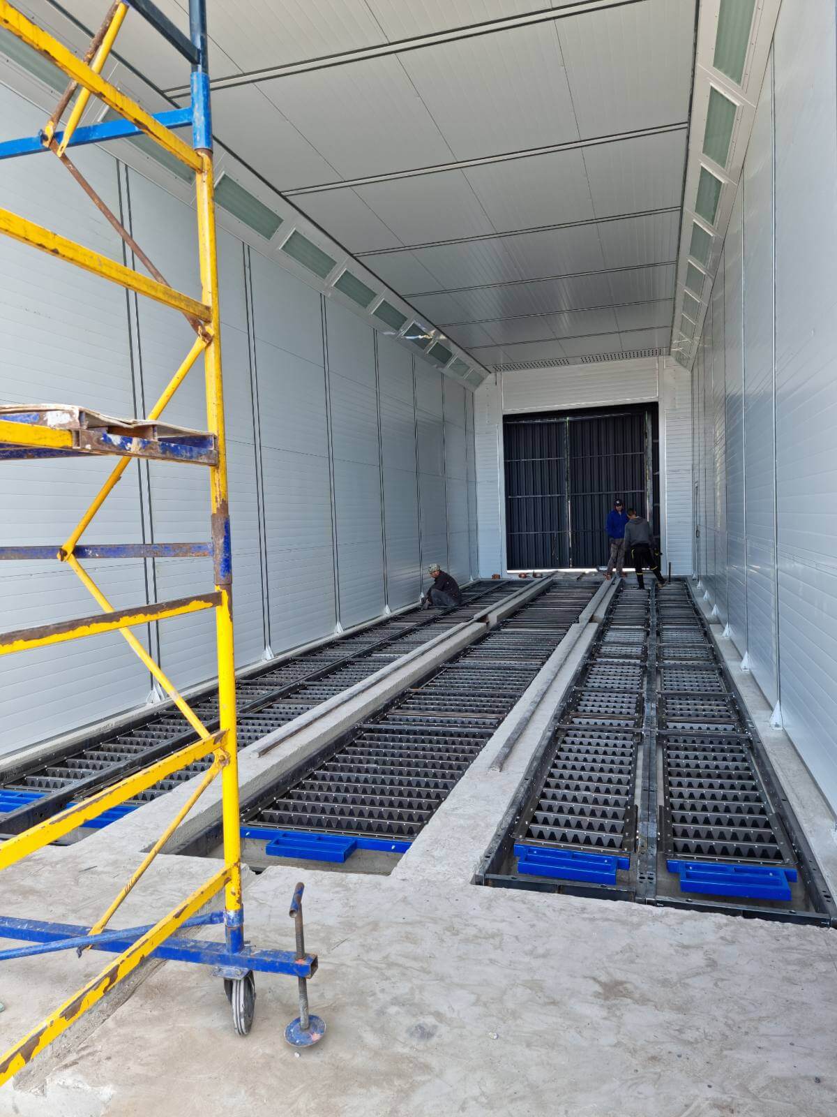 - Návrh: Návrh komor začal analýzou technických specifikací s ohledem na rozměry (15 000 × 5 500 × 5 000 mm), produktivitu a bezpečnost, s obchodní nabídkou (slepý typ). Dokumentace (základy, elektřina, stlačený vzduch, plyn) byla přizpůsobena hangáru o rozměrech 40 000 × 10 000 × 6 000 mm a předána zákazníkovi v lednu 2023.