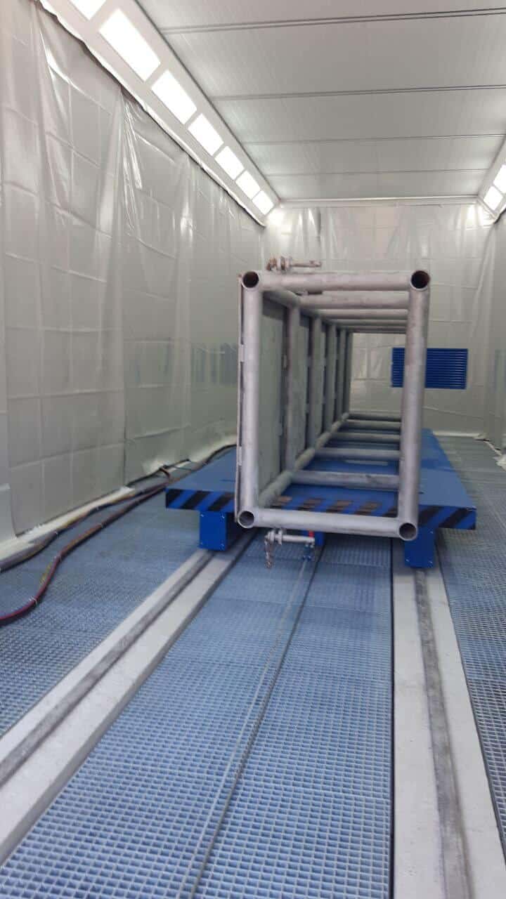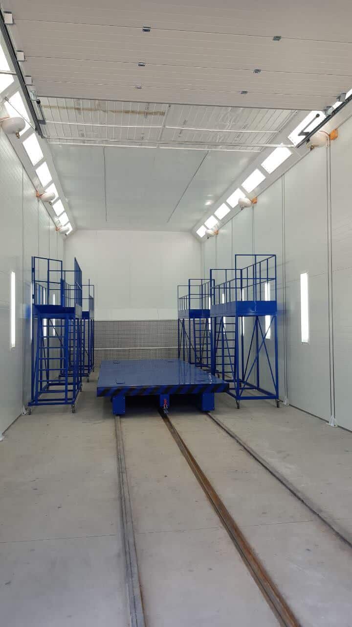 | Transportní systém | Integrace s kolejovým vozíkem (model RTK-20-6) s nosností 20 t a lanovým pohonem, vybaveným tlačítky „STOP“, 2 kusy, plus 4 vozíky pro lakýrníky (závěsné plošiny pro operátory v KFS během lakování). | |