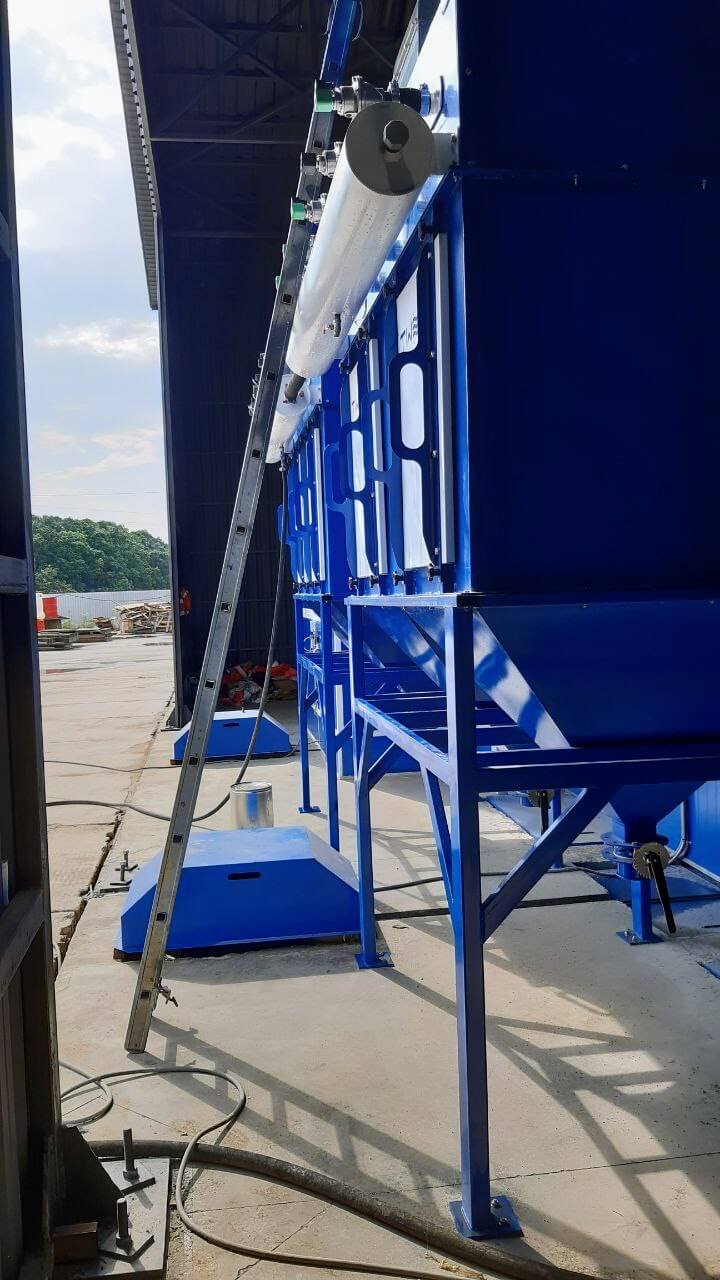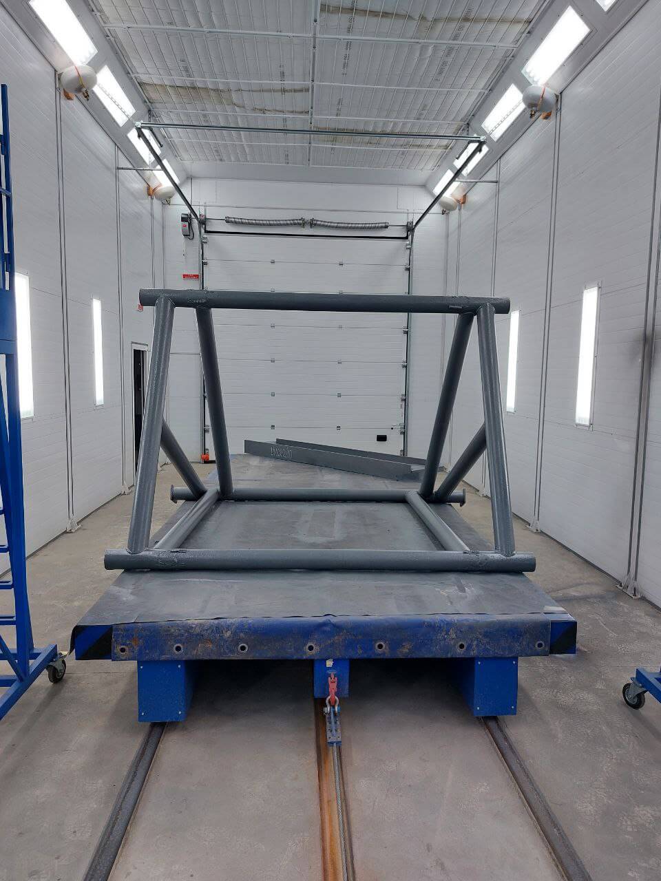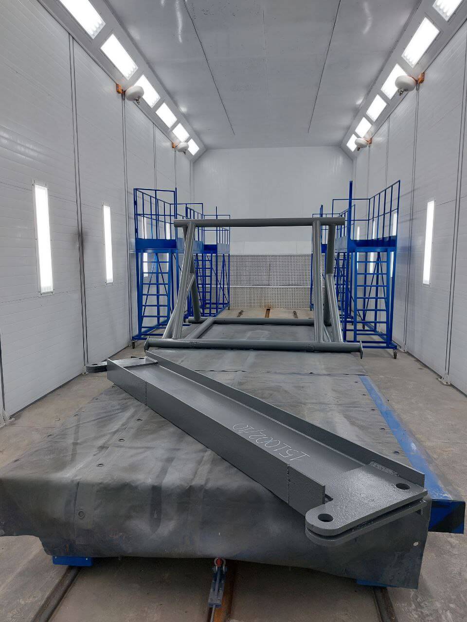 TWEKO realizovalo komplexní řešení: komoru pro abrazivní tryskání KASO-15 a lakovací a sušící komoru IKFS-D (model KFS000.00.00-ENERGIE „D“) s pracovní zónou 15 000 × 5 500 × 5 000 mm. Obě systémy byly integrovány do jednotného výrobního cyklu prostřednictvím kolejových vozíků RTK-20-6 (2 kusy, nosnost 20 t, rychlost 0,5–1,5 m/min), které umožňují plynulý přesun dílů mezi komorami. Systém regenerace abraziva (KASO), diagonální ventilace (až 30 000 m³/h v IKFS-D), dieselový hořák (310 kW) a vícestupňová filtrace vytvářejí uzavřený energeticky efektivní cyklus splňující mezinárodní a ekologické standardy. Výroba zařízení proběhla v továrně TWEKO v Kyjevě, dodávka byla realizována postupně podle podmínek DDP (Incoterms 2010). Montáž začala koncem ledna 2023 po přípravě základů a komunikací zákazníkem a byla dokončena v červnu 2023 uvedením do provozu a školením obsluhy (2 operátoři na směnu, práce v OOP, 8hodinový cyklus).