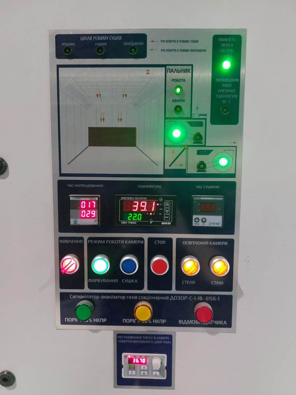 | Řídicí systém | Řídicí panel s indikátory stavu a tlačítky nouzového zastavení. | Řídicí panel s regulací lakování a sušení, detektorem plynů a tlačítky nouzového zastavení. |