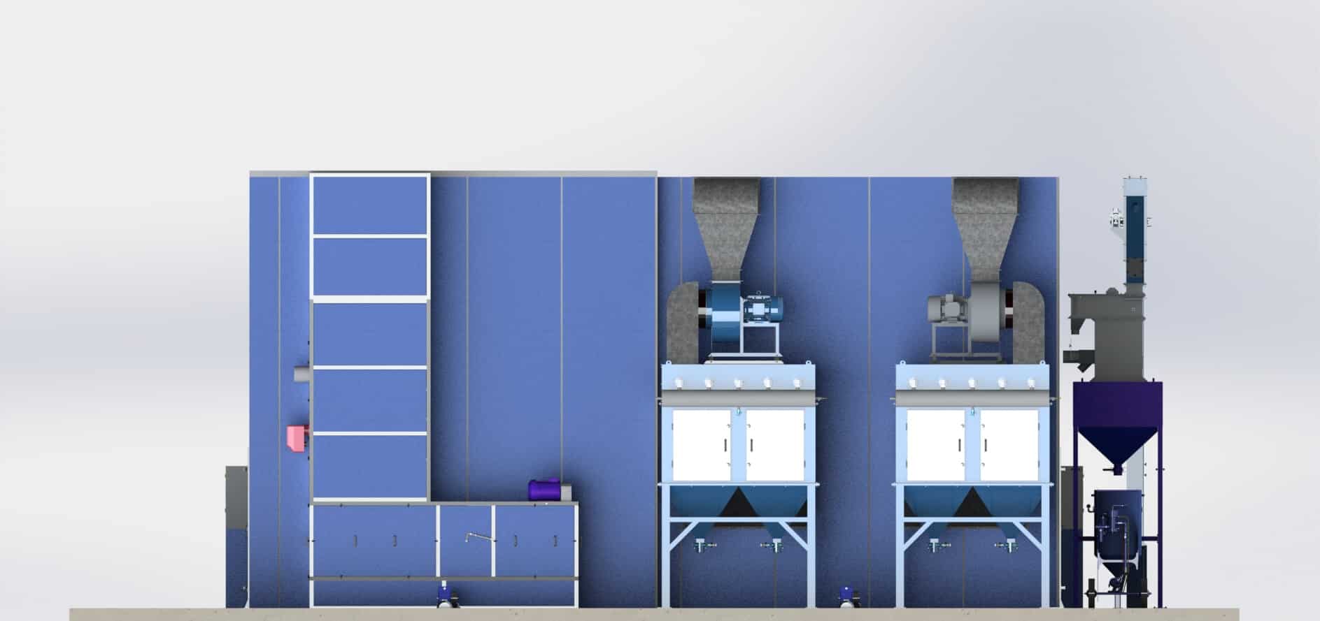 | Systém regenerace | Shromažďování, čištění a opětovné použití ocelových broků G25–G40 se škrabkovým podlahovým systémem, dopravníkem, separátorem a zásobníkem. | Automatizovaný systém regenerace vzduchu s ventilátory pro diagonální proud vzduchu (až 30 000 m³/h), filtry a rekuperátorem. |