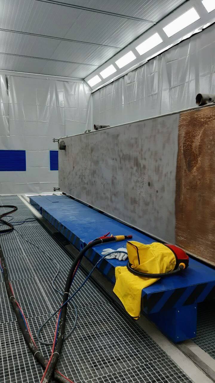 Poltavská vrtná společnost s.r.o. zadala TWEKO úkol modernizovat lakovací úsek pro zpracování velkorozměrných ocelových konstrukcí vrtného vybavení (až 13 000 × 3 000 × 3 000 mm, hmotnost až 20 000 kg). Cílem bylo vytvořit slepou technologickou linku integrující čištění povrchů na SA 2.5 (ISO 8501-1), nanášení ochranných nátěrů o tloušťce 75–125 µm a sušení při teplotě až 60 °C. Podle technických specifikací musel komplex zajistit automatickou regeneraci abraziva, efektivní filtraci vzduchu, energetickou účinnost (až 50 kW pro čištění, 30 kW + dieselový hořák 310 kW pro KFS) a bezpečnost a ekologičnost výroby. Slepé uspořádání s kolejovým transportem optimalizovalo pohyb dílů v hangáru o rozměrech 40 × 10 × 6 m, minimalizovalo prostoje a zajistilo efektivní pracovní cyklus.