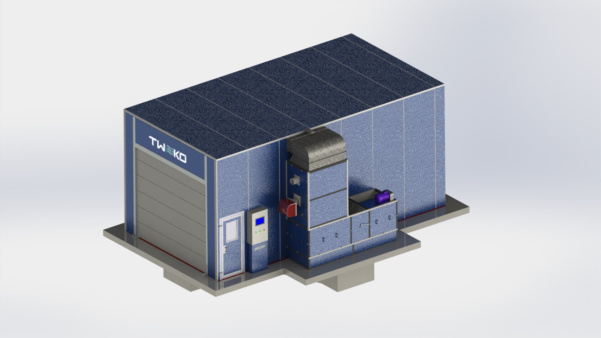 - Individuální řešení: TWEKO vypracovala výkresy pódia pro instalaci komory s roletovými vraty na rovnou podlahu, s ohledem na omezení zadavatele ohledně základu.