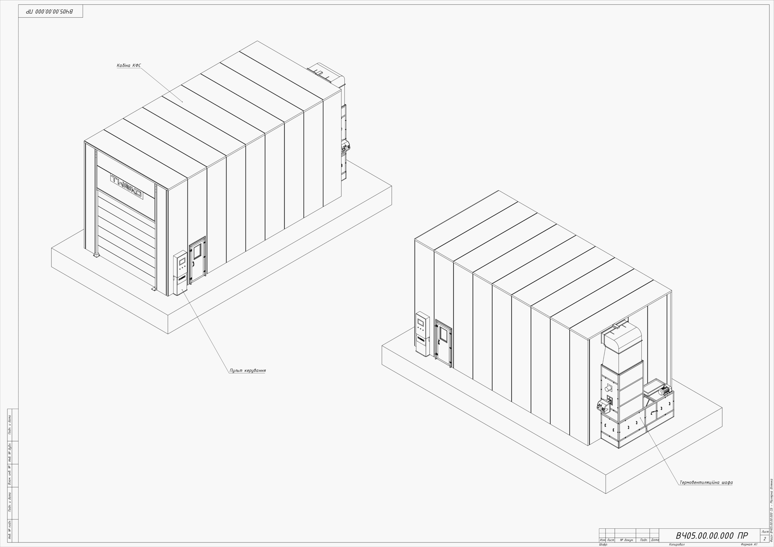 - Vjezdová vrata (4000×4000 mm) s dveřmi pro personál, protipožární klapka, sady přívodních a výfukových vzduchovodů, komín.