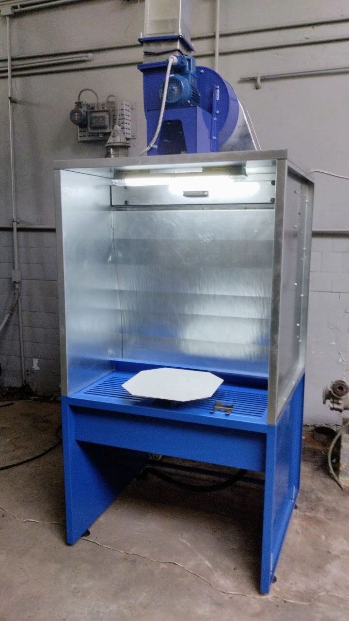 - Odsávací skříň AS Hydro (ASH-1). Vybavena vodní clonou (1×0,9 m) s tříúrovňovou filtrací (voda + Paint Stop EU4, čištění až 95 %), nevýbušným ventilátorem (2200 m³/h, 1,98 kW), vodním čerpadlem (1,2 kW, 200 l/min) a hermetickým LED osvětlením (2×18 W). Skříň byla integrována s komunikacemi zákazníka (vzduchovod 390 mm, kanalizace 50 mm, přívod vody 3/4″ s kulovým ventilem) prostřednictvím flexibilní vložky, přechodu a kruhového vzduchovodu.