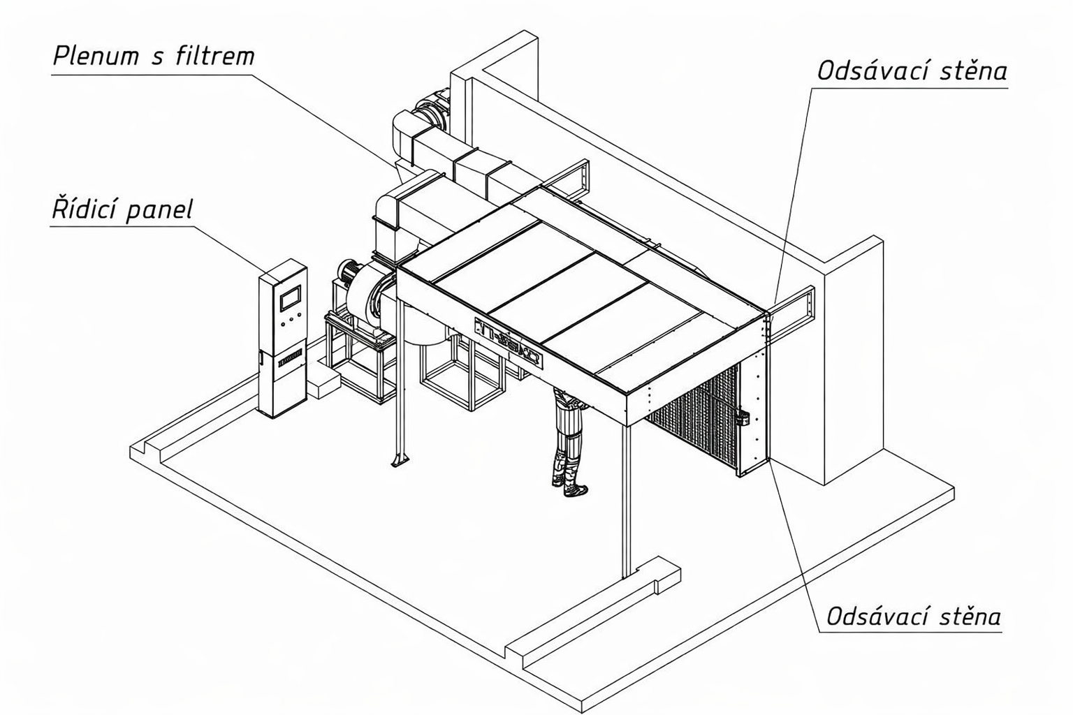 Přívod čištěného vzduchu je realizován přes horní plénum, zatímco odvod probíhá přes odsávací stěnu napojenou na výkonný odsávací systém. Tento princip zajišťuje efektivní zachycení aerosolů a ochranu pracovního prostředí.