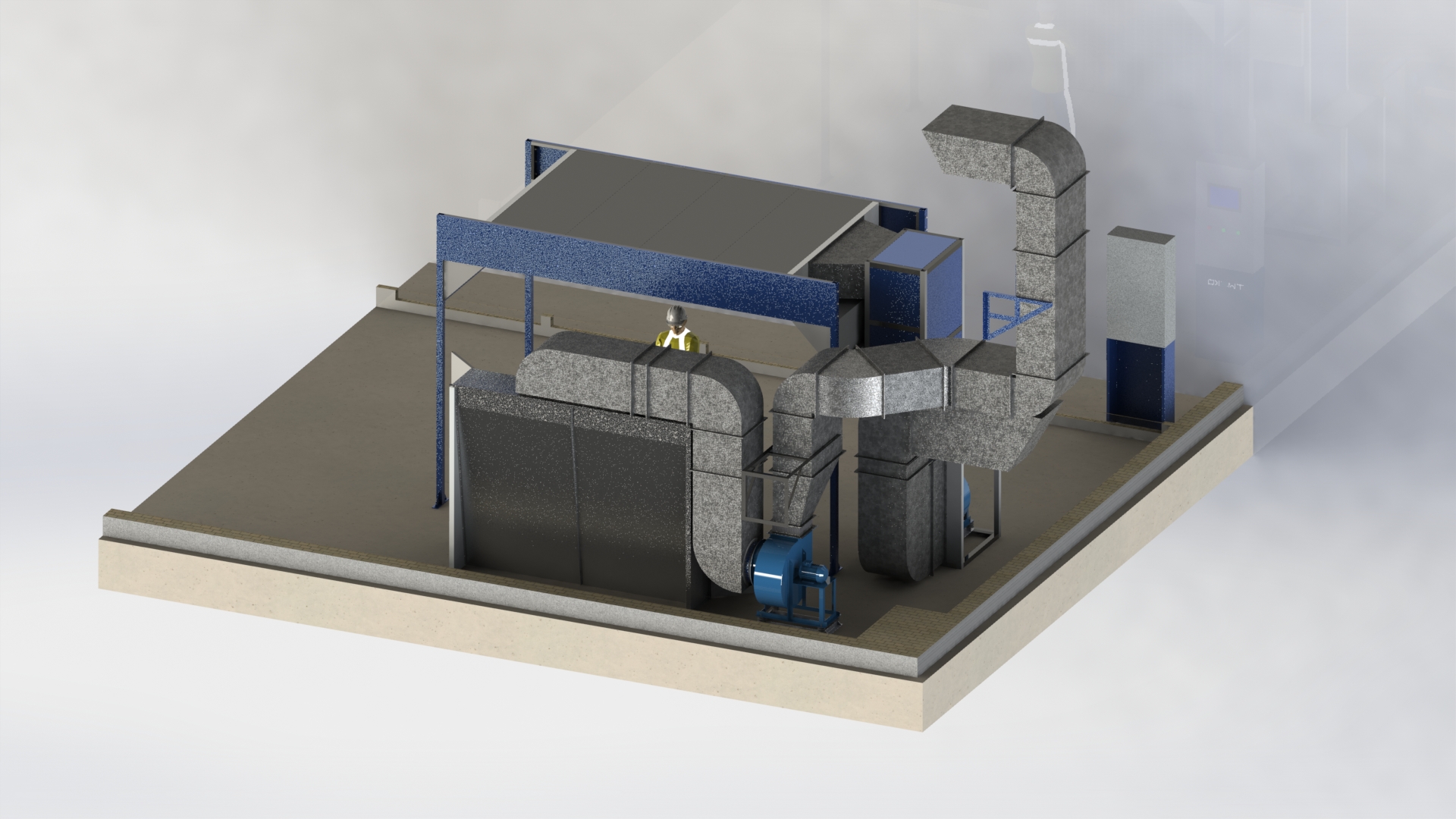 Pracovní zóna stanoviště činí 4000×2490×2500 mm (Š×H×V), celková výška konstrukce je přibližně 2940 mm. Uspořádání umožňuje instalaci přívodní jednotky mimo pracovní zónu a napojení na odsávací systém pomocí vzduchovodů. Řešení zajišťuje stabilní podmínky lakování a kontrolu znečištění v pracovní zóně, což je klíčové pro moderní průmyslové lakovny.