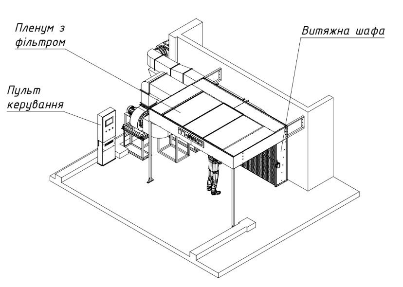 Řešení zahrnuje přívodní a odsávací ventilaci s výkonem až 8000 m³/h, horní plénum pro přívod vzduchu a odsávací stěnu pro efektivní zachycení lakovacího aerosolu. Tento lakovací box je navržen jako součást vybavení lakovny pro stabilní a kvalitní průmyslové lakování.