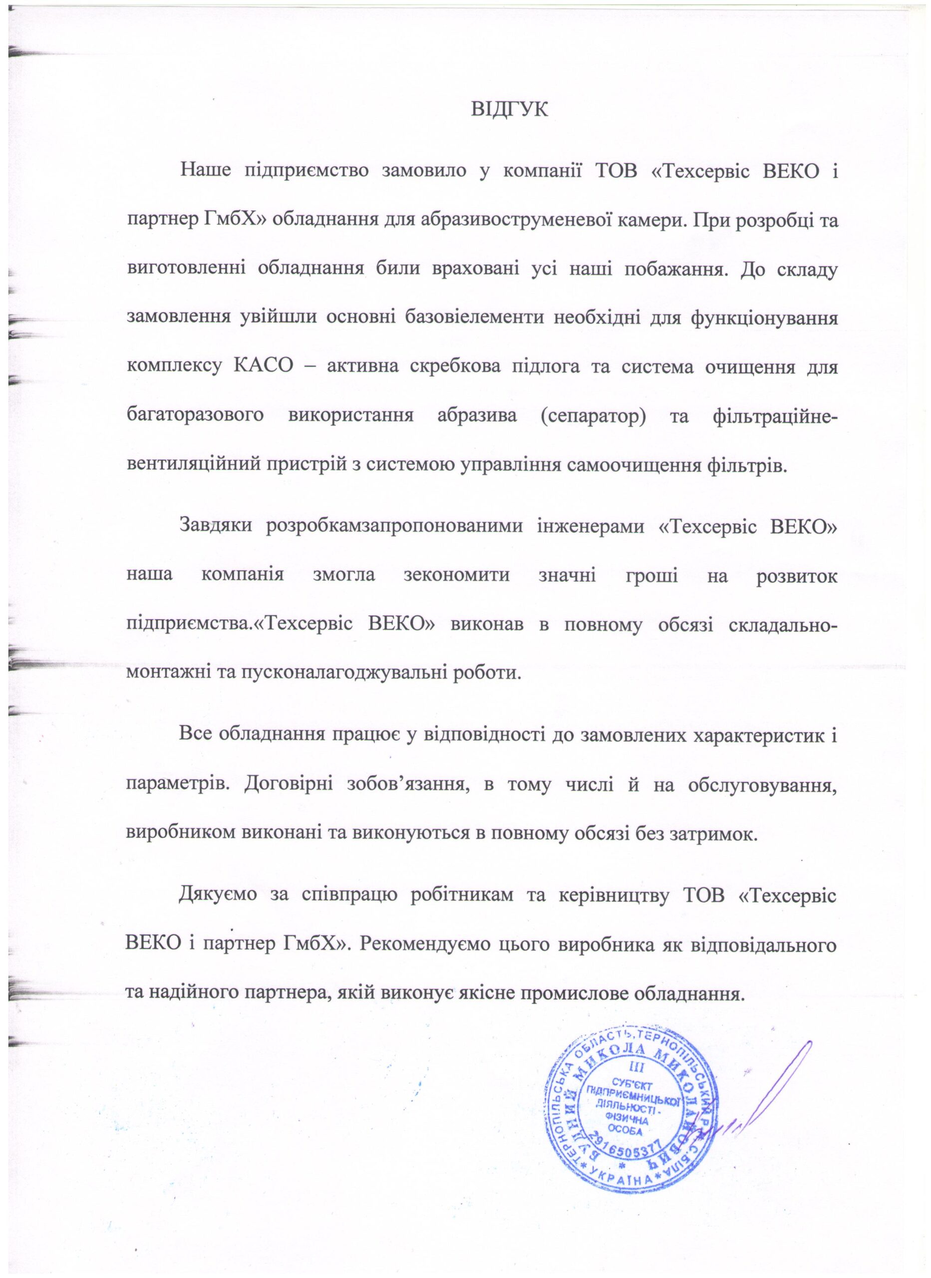 V roce 2018 společnost TWEKO realizovala komplexní projekt dodávky zařízení pro tryskací komoru pro ukrajinský průmyslový podnik BADOR v obci Bila v Ternopilské oblasti. Instalovaný tryskací systém výrazně zvýšil efektivitu povrchové úpravy návěsů a karoserií, optimalizoval výrobní procesy a snížil náklady společnosti.