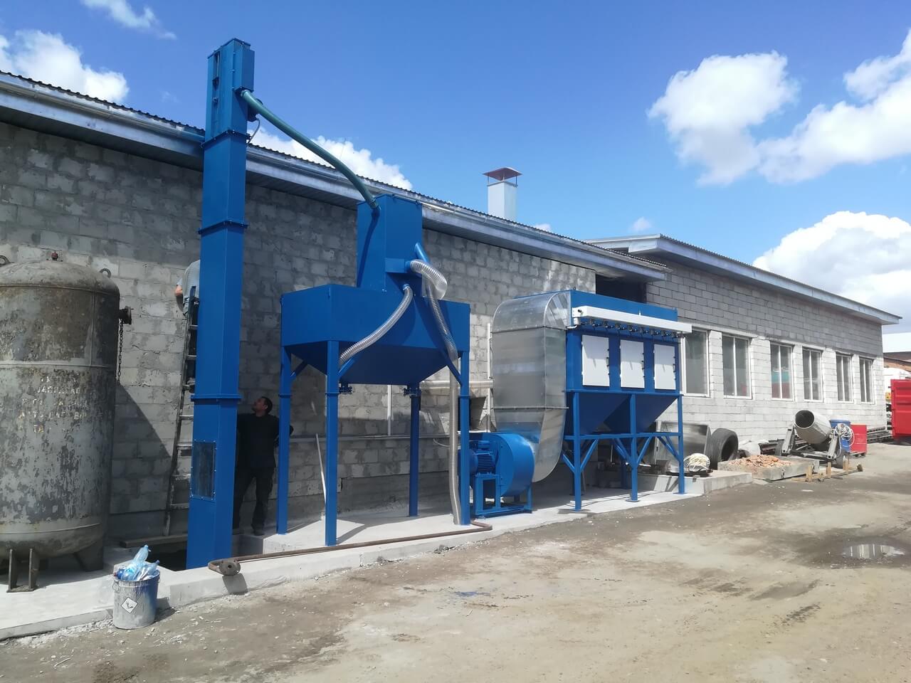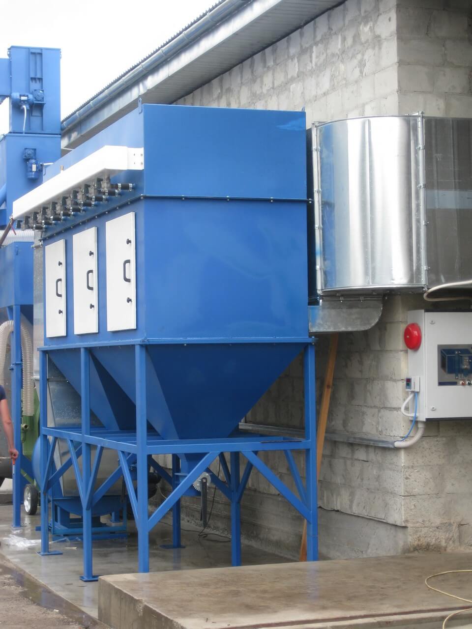 - Systém regenerace abraziva. Zahrnuje elevátor vysoký 7,5 m, separátor a zásobník o objemu 1 m³. Elevátor, vybavený motorovým převodem a pásem s lopatkami, zvedá směs abraziva a prachu z jímky do výšky 7 m, kde materiál přechází do separátoru. Separátor odděluje velké nečistoty a prach, přičemž čisté abrazivo se shromažďuje v zásobníku a je v poloautomatickém režimu přiváděno do tryskacích zařízení.