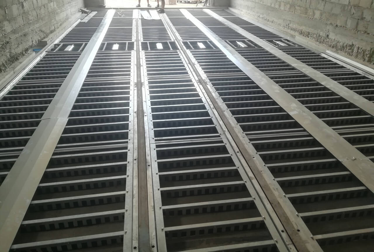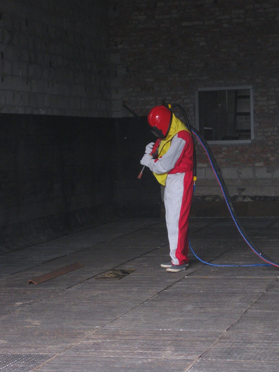- Škrabací podlaha. Systém se skládá ze šesti podélných modulů o délce 15 m a jednoho příčného modulu umístěného uprostřed komory. Podélné moduly odstraňují abrazivo a prach z podlahy a směřují je k příčnému modulu, který materiál dopravuje do jímky pod elevátorem.