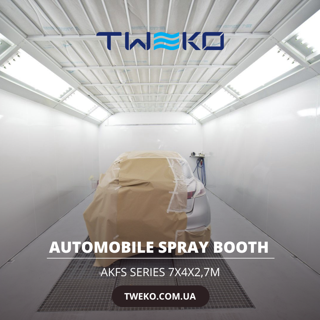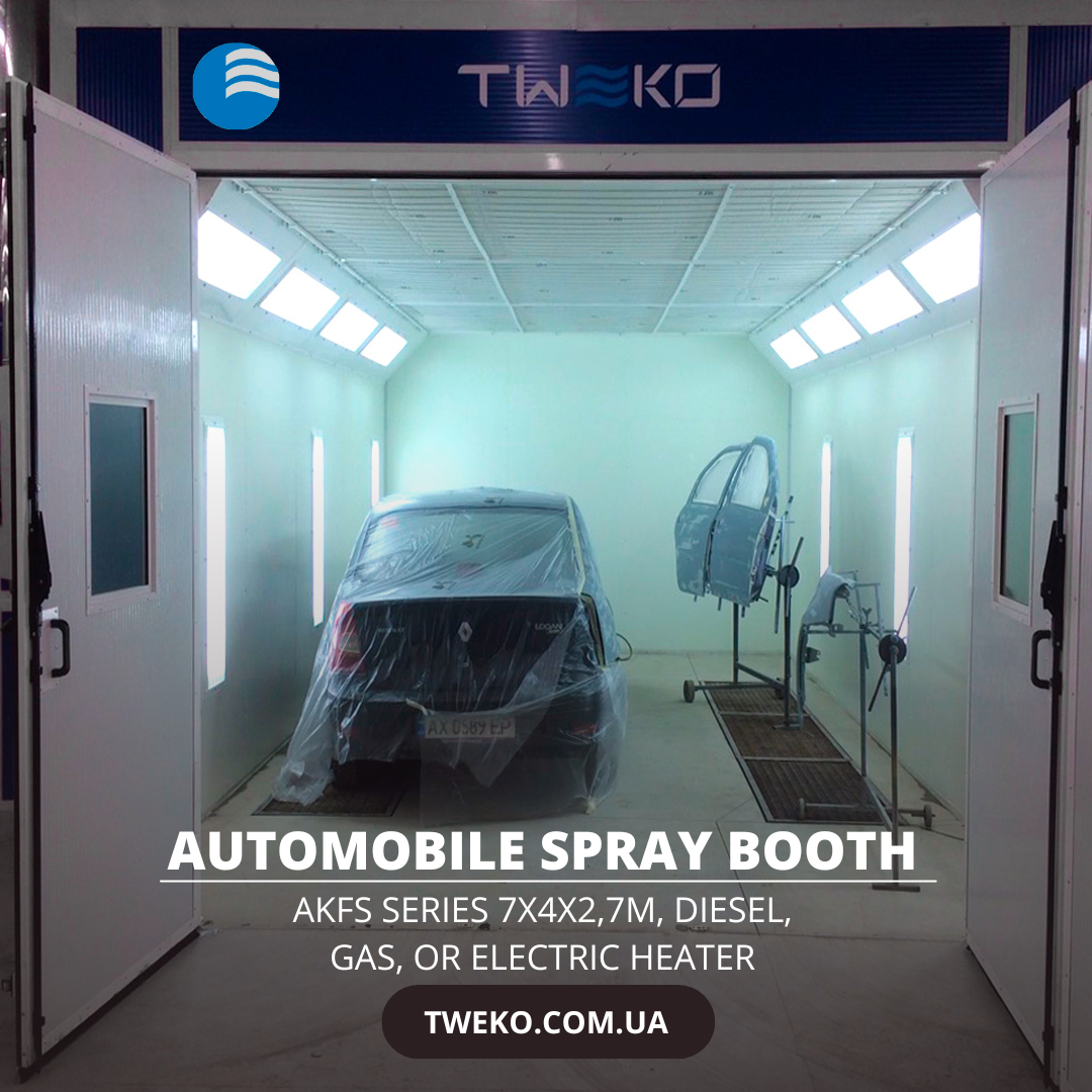 Car painting booth: AKFS Electro series – an environmental solution for energy consumption by auto repair workshops. International standards. The air is heated by: an electric heat exchanger. High rates of efficiency. Mounted on a flat floor or foundation, with air ducts.