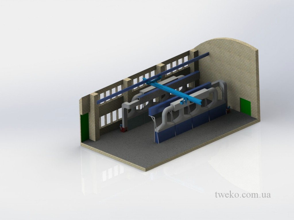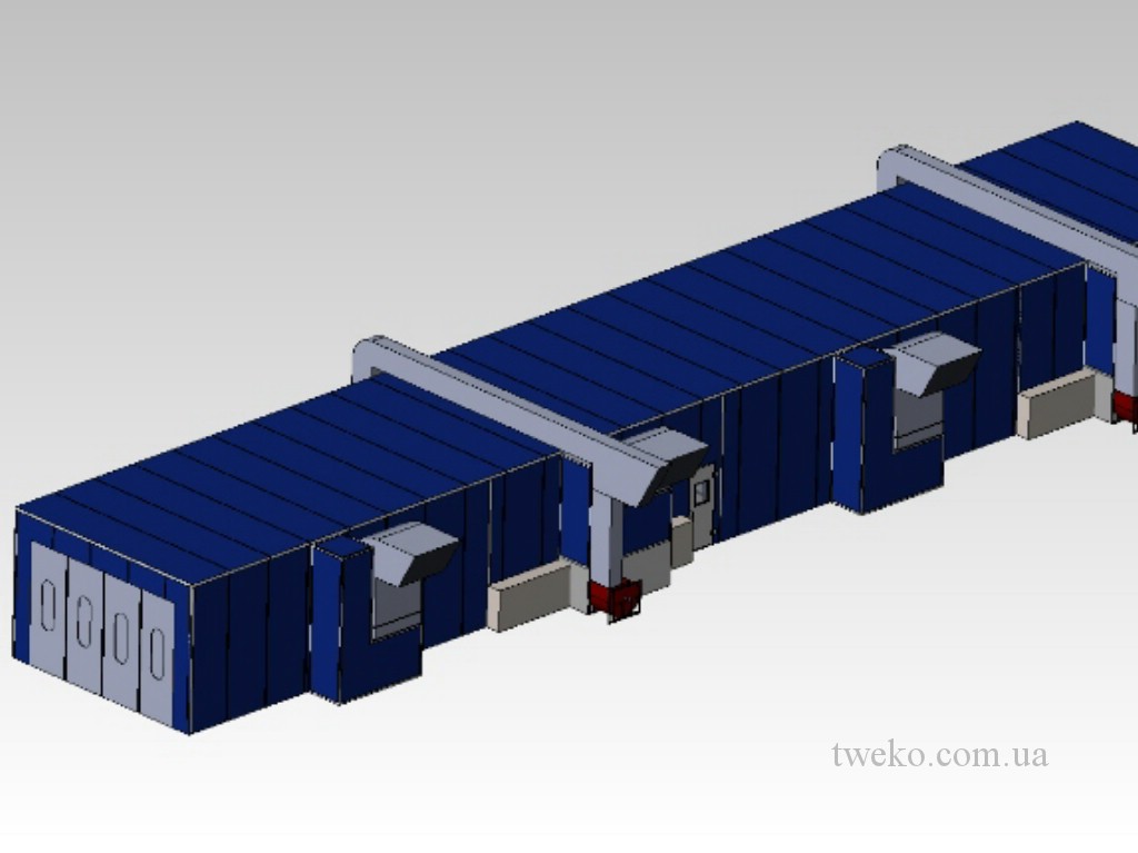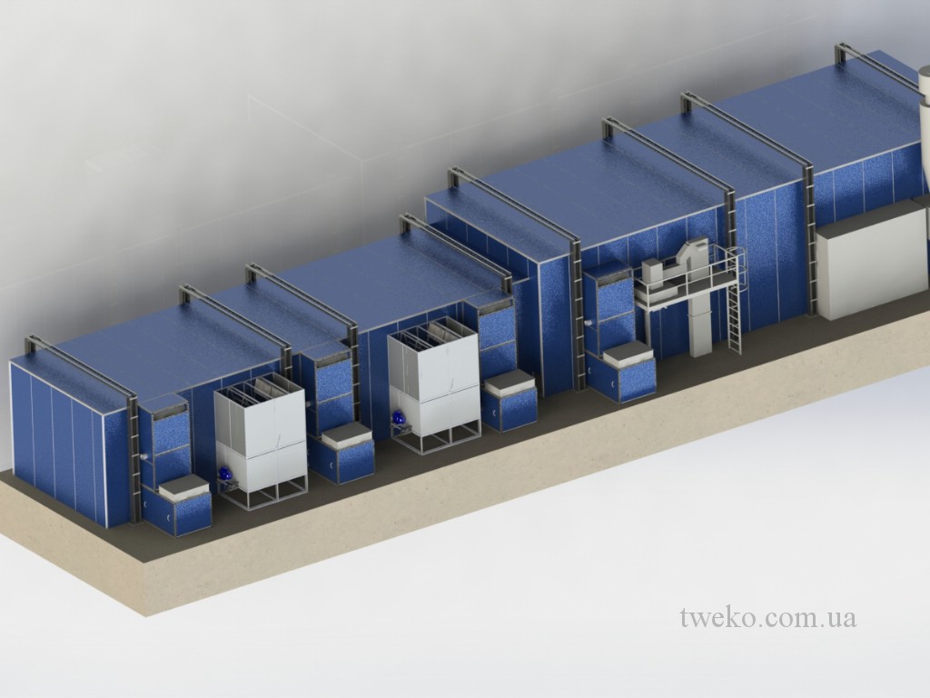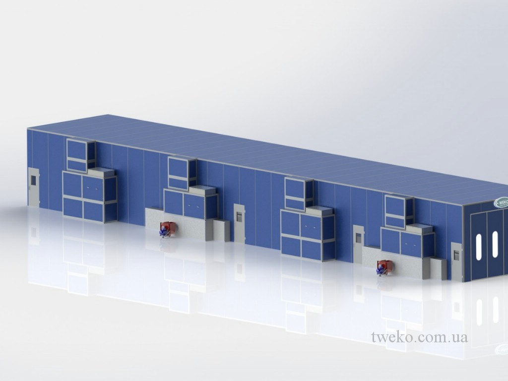 During its existence, our company has developed dozens of different designs of spray booths for agricultural machinery, moreover, it took up to six months to develop one concept for them, a striking example is the Nezhinsky Mechanical Plant, for which it was necessary to equip a shot-blasting chamber, coating and their further drying, as well as the system of transportation and canting of products during processing. Read more about this project in: production of a spray booth for agricultural machinery, a painting complex for agricultural machinery. In addition, we have developed and implemented a project for the paint department for the Belotserkovmaz Scientific-Production Enterprise, it consists of one shot-blasting chamber, two paint booths and two drying chambers with dimensions of 9000x5500x3000h mm.