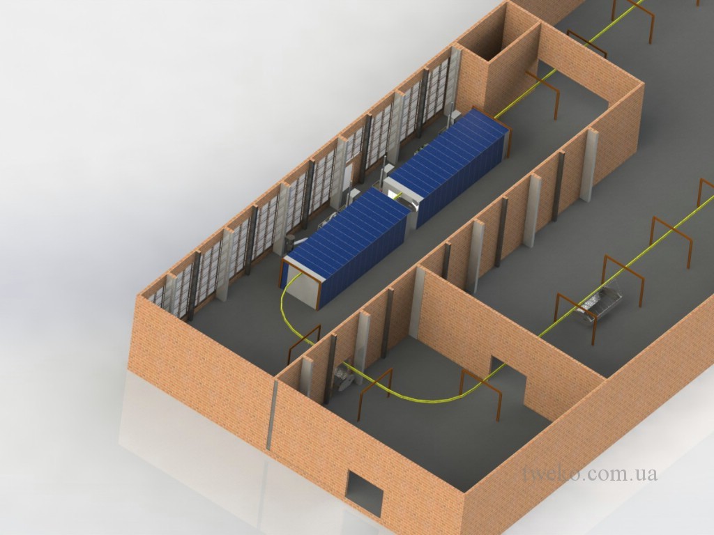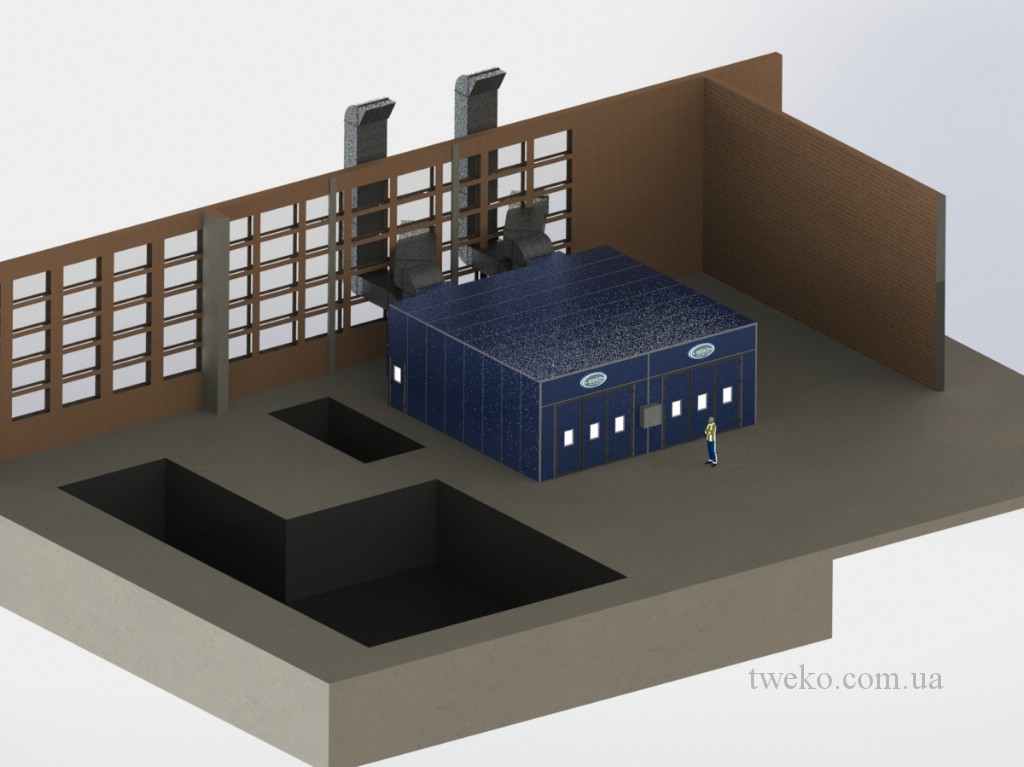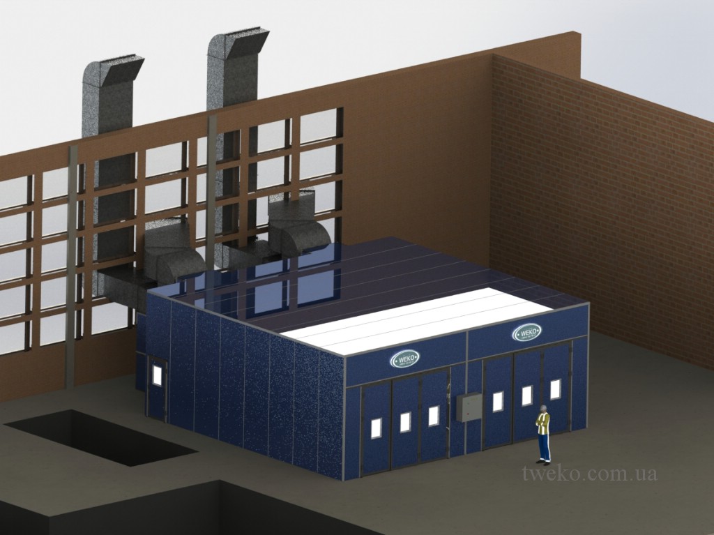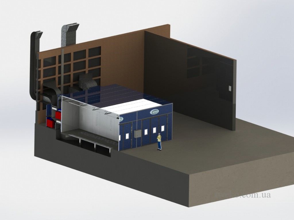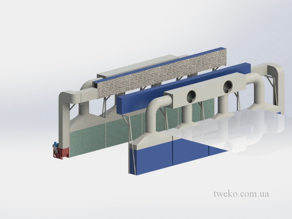 During its existence, our company has developed dozens of different designs of spray booths for agricultural machinery, moreover, it took up to six months to develop one concept for them, a striking example is the Nezhinsky Mechanical Plant, for which it was necessary to equip a shot-blasting chamber, coating and their further drying, as well as the system of transportation and canting of products during processing. Read more about this project in: production of a spray booth for agricultural machinery, a painting complex for agricultural machinery. In addition, we have developed and implemented a project for the paint department for the Belotserkovmaz Scientific-Production Enterprise, it consists of one shot-blasting chamber, two paint booths and two drying chambers with dimensions of 9000x5500x3000h mm.