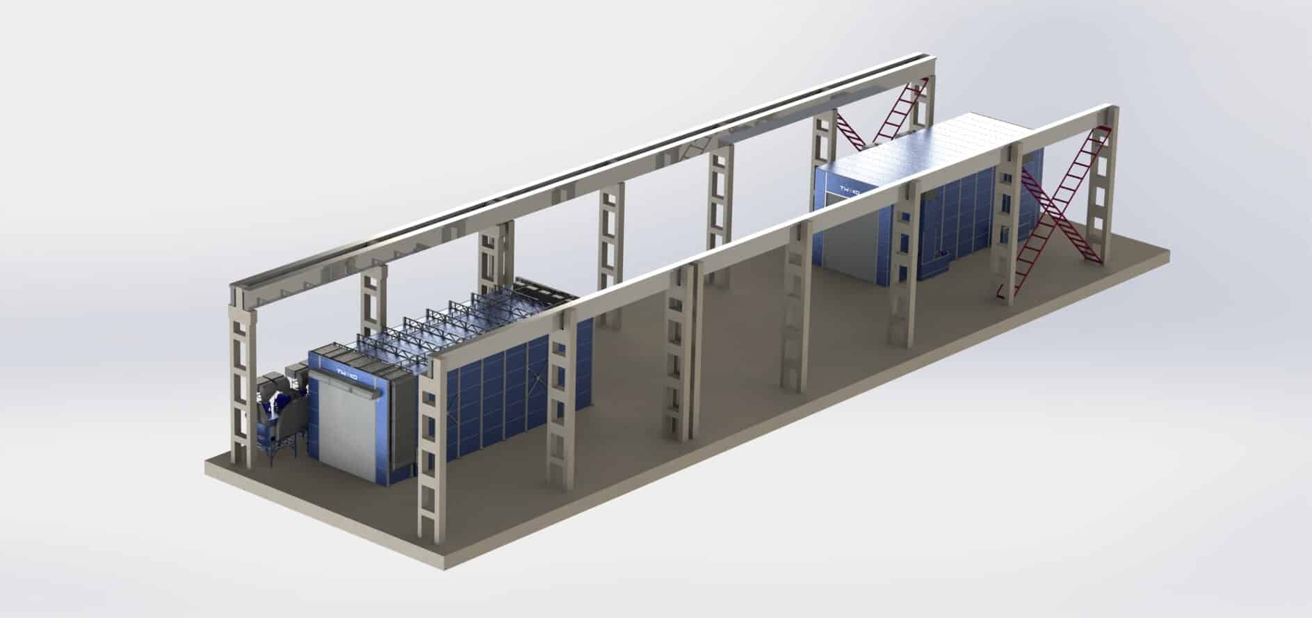 Worker mobile elevating platforms are provided on both sides of the working zone, ensuring safe and convenient access to all surfaces of oversized products.The ventilation system is based on supply and exhaust units, each with a capacity of 26,000 m³/h; the configuration includes four supply and four exhaust units, providing the required air exchange in the working volume.