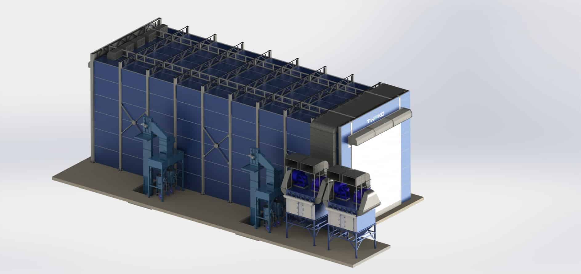 - Abrasive blasting chamber of the KASO series manufactured by TWEKO — model KASO-20 with internal cabin dimensions 20,000 × 6,500 × 7,000 mm.