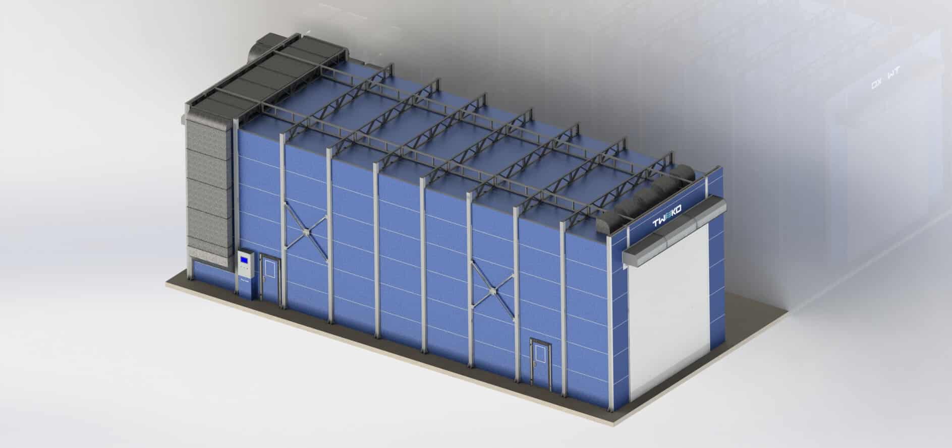 To support abrasive blasting, paint coating application, and drying of large-scale products, TWEKO supplied and installed a complete equipment complex comprising an abrasive blasting chamber of the KASO series, model KASO-20, and a paint and drying booth of the IKFS series, model IKFS-20 KFS.000.00.00-ENERGY “D”.