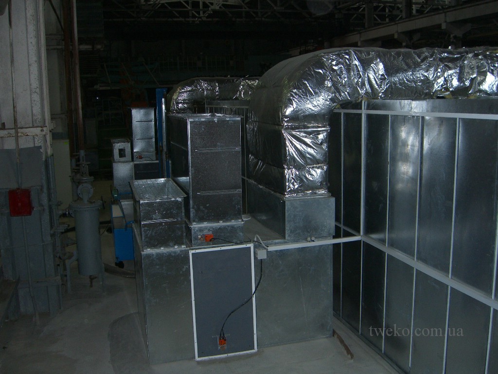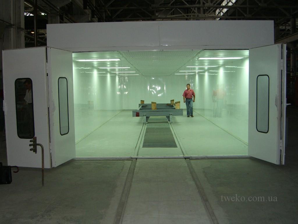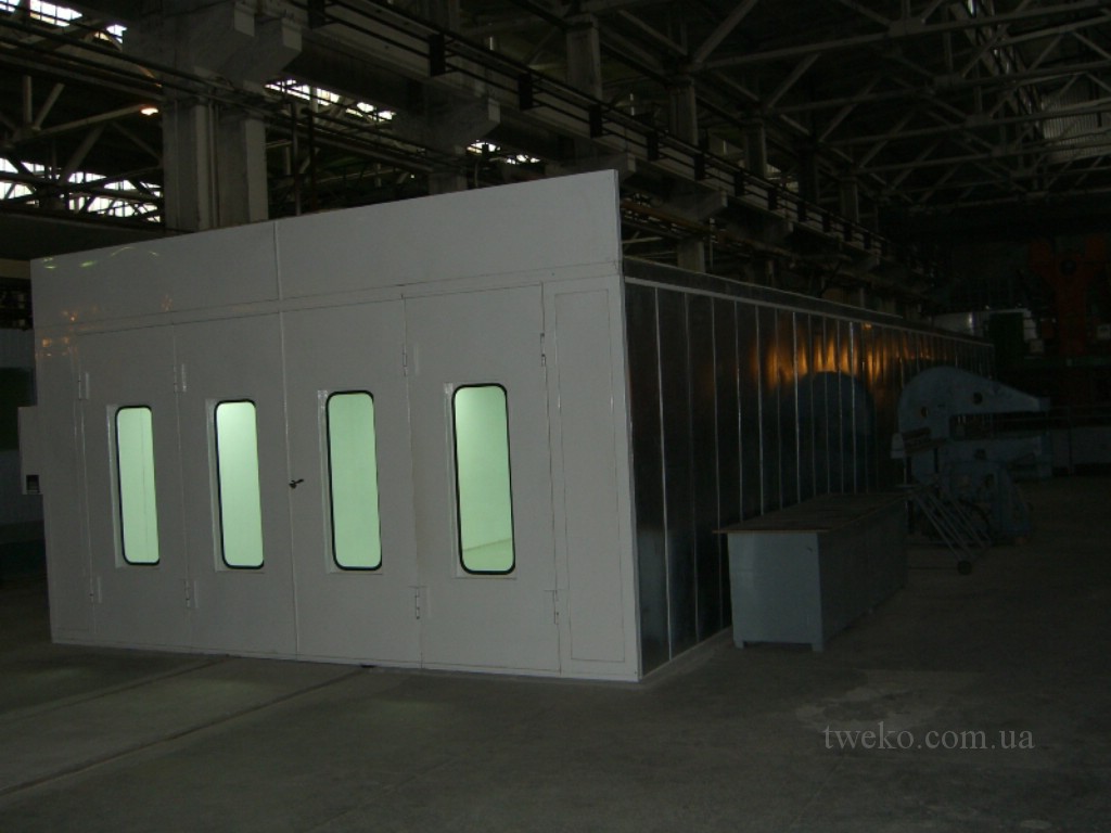 Aircraft painting and drying booth (for curing polymer coatings), with internal dimensions of 12x5x3 meters, featuring strict temperature-time regimes, air heating via an electric heat exchanger.