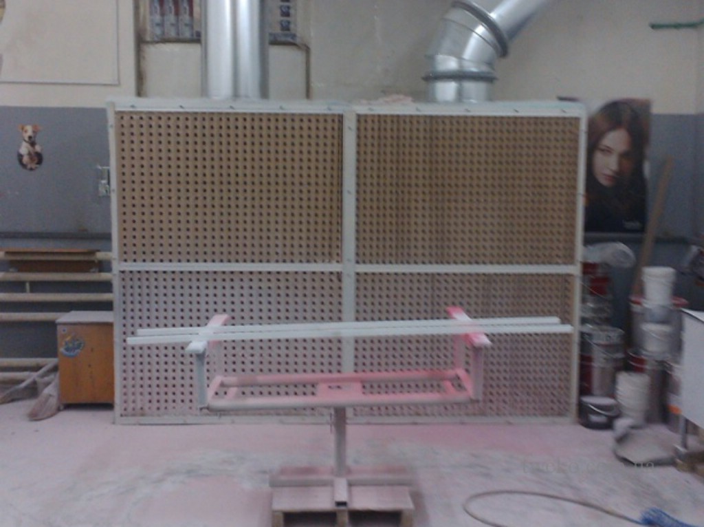 - Dry paint booth. The paint booth is constructed as a metal frame cabinet made of profile tubes and angles, clad with powder-coated sheets. The front features two filter frames (2500×1000 mm each). The dual-stage filtration system includes: 1) a cardboard labyrinth filter with high absorption capacity; 2) a fiberglass filter for additional purification. The ventilation unit’s capacity is 10,000 m³/h, powered by a centrifugal fan with a 2.2 kW / 1000 RPM motor.