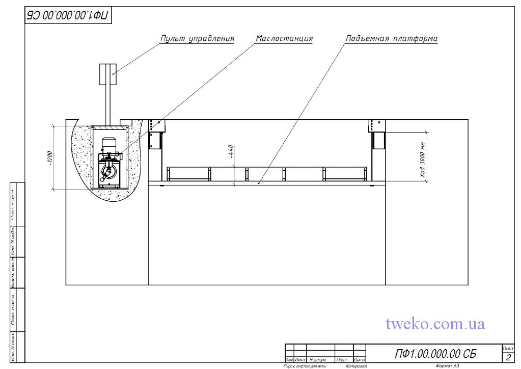 - The yacht elevator performs vertical linear motion, driven by executive mechanisms—hydraulic cylinders and tackle blocks. The hydraulic cylinders are powered by an electro-hydraulic system connected to a pumping station and control panel.