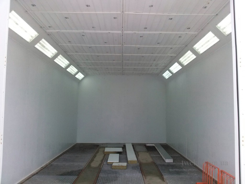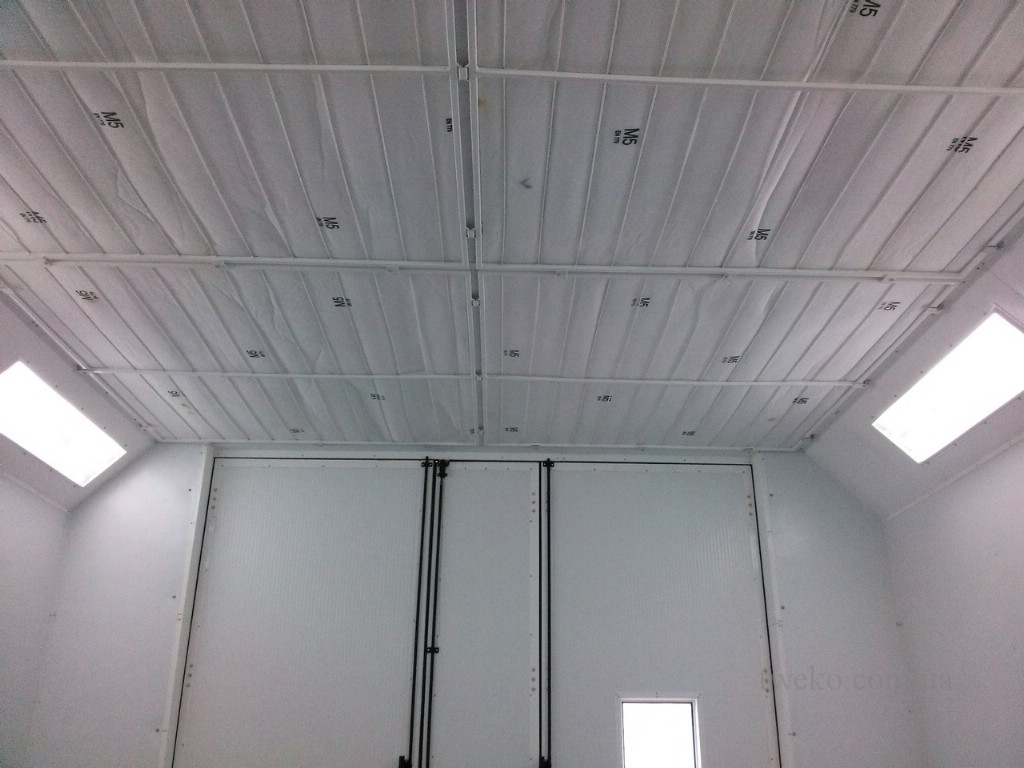 Since the chamber is located in the open air, outdoors, the sandwich panels of the chamber cabin and thermal ventilation group have improved thermal insulation, their thickness is 100 mm, as well as additional hydraulic protection and improved sealing of all camera components. The internal size of the camera is 8100x4500x3500, which allows you to paint both cars and vans. The ceiling plenum has a size of 8000x4000x500, the area of the ceiling filter material is 32 m². The lighting in the chamber is two-level, consists of two upper rows located at an angle of 45º to the ceiling, and two side rows of sealed fluorescent lamps.