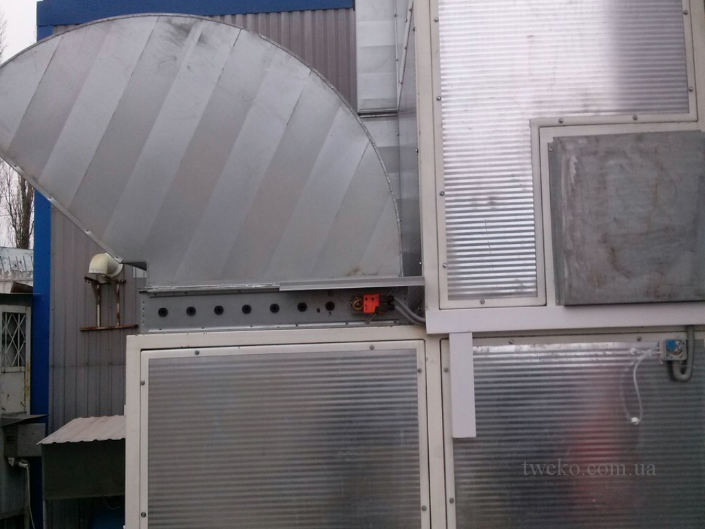 The thermal ventilation group of the painting and drying chamber will consist of one, combined – supply and exhaust, thermal ventilation cabinet (TVC). TVC will be located at the back of the chamber cabin. The air handling unit capacity will be 26,000 m3/h, an electric motor with a capacity of 15 kW at 1,500 rpm. TVС provides an air exchange rate of at least 200 times/hour in the painting mode and at least 50 times/hour in the drying mode, which ensures uniform blowing and quick drying of the painted product, as well as acceptable conditions for the operator to work during painting (comply with EU labor protection standards). TVС has three gate devices: a supply, discharge and recirculation gate, which direct air flows in accordance with the selected chamber operation mode. The thermal ventilation cabinet uses a heat exchanger made of heat-resistant steel with a diesel burner with thermal power of 300 kW as a heat-generating installation.