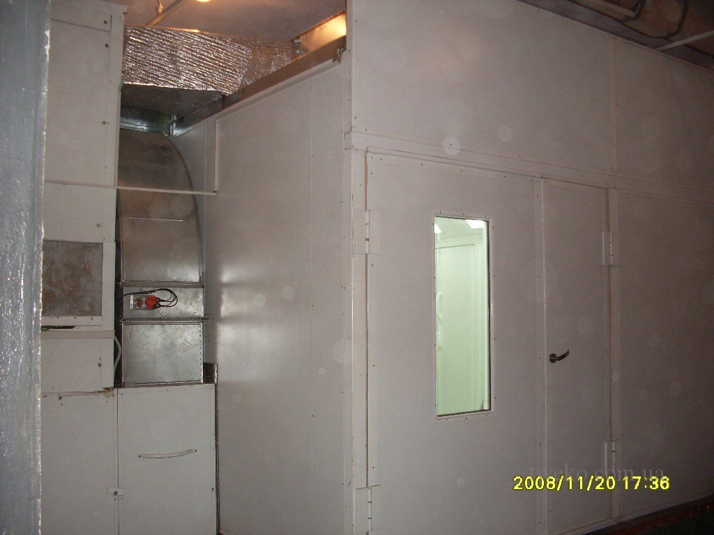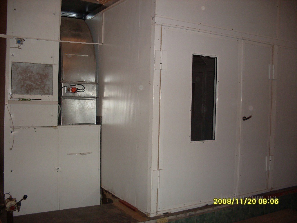 - Paint and Drying Booth, Model KP 05-5100 (serial no. 31). The booth consists of two cabins: a painting cabin (5,090×4,000×2,500 mm) and a drying cabin (5,090×3,725×2,200 mm), constructed from 50 mm sandwich panels with fire-resistant filler and galvanized coating. It is equipped with a diesel heat generator for air heating (18–25°C for painting, 50–70°C for drying) and centrifugal fans with high efficiency (air exchange rate up to 200 times/hour). Lighting is provided by two rows of sealed fluorescent fixtures (4×40 W in the painting cabin, 2×40 W in the drying cabin). The filtration system includes ceiling and floor filters, as well as preliminary pocket-type filters. Air is exhausted through channels in the concrete foundation. A control panel with automation ensures monitoring of pressure, temperature, and operating modes.