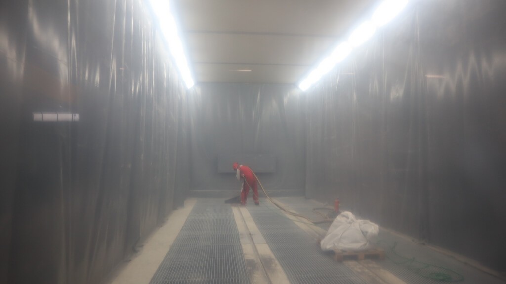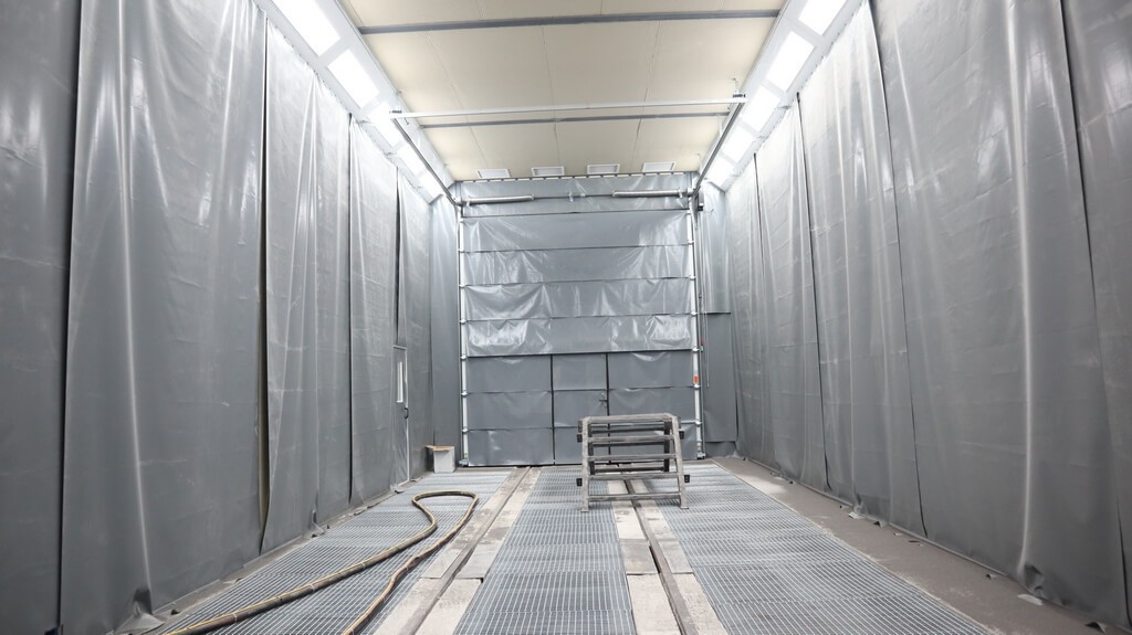 The abrasive blasting chamber has an internal size similar to the spray booth – 15x5x5m. The chamber has a sealed cabin made in the form of a prefabricated steel structure with sandwich panels. The inside of the cab is lined with an elastic soft material that protects the steel structures of the cab from damage by ricochet shots. The camera is illuminated by two rows of ceiling, located at an angle of 45 °, four-lamp LED luminaires, protected from possible mechanical damage by ricocheting shot. The chamber quickly and effectively cleans the dusty air that forms during the cleaning process; for this, it is equipped with a FVU-30 filter ventilation unit. FVU-30 is one of the models of filtering units developed by our company, it has a productivity of 30,000 cubic meters per hour, 30 cylindrical dust filters and an automatic filter cleaning system.