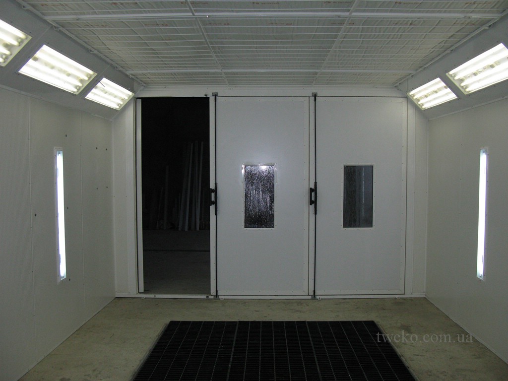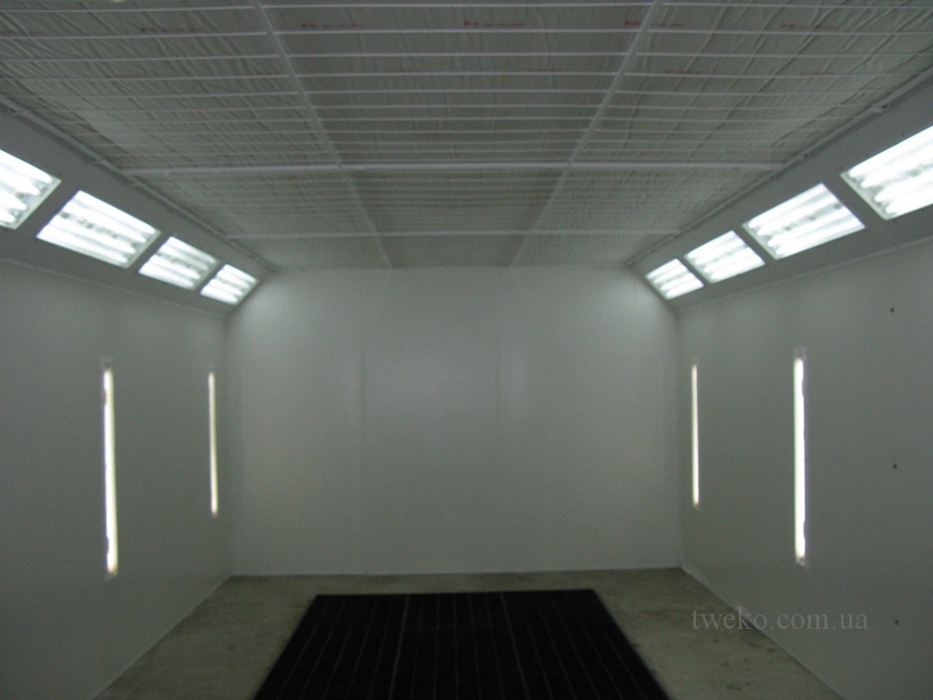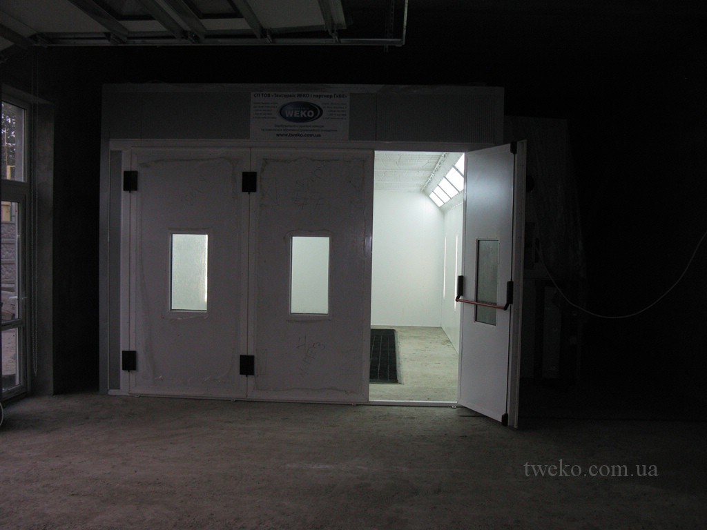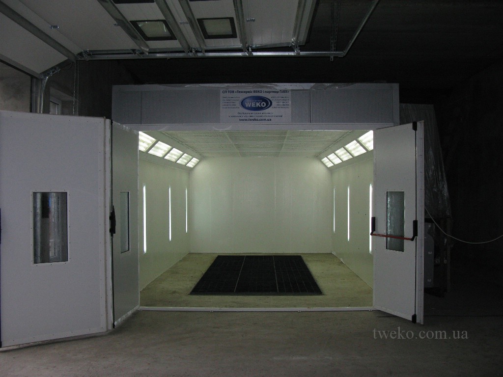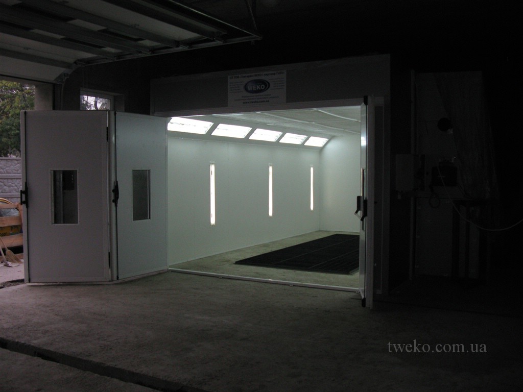 Painting chamber for car with increased ventilation group, internal size 7x4x2.7 m, on a previously prepared concrete base with air ducts, heating air — diesel burner. The chamber has a reinforced structure, sandwich panels with a thickness of 100 mm are used, all parts of the chamber have been pre-sandblasted and have a double layer of protective paint coating.