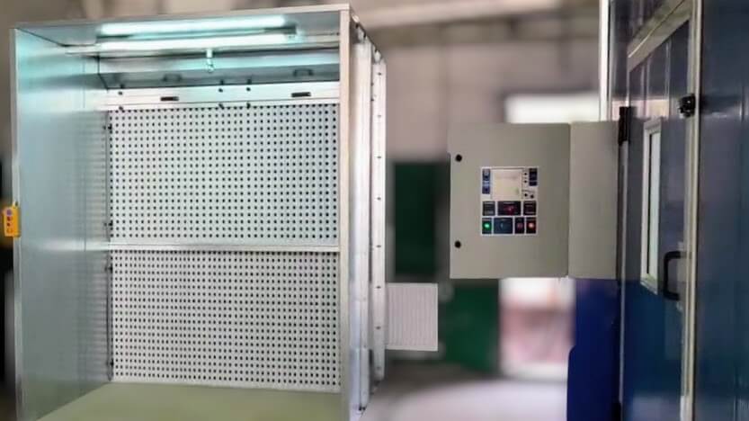 - Painting Chamber with Dry Filtration, Model КФ.000.00.00-ЕNERGY, ASS Cabin-2 Series. The chamber, sized 2×1×2.4 m, features an extraction zone of 2×2 m and a capacity of 8000 m³/h. A two-level filtration system (cardboard labyrinth and fiberglass) ensures air purification up to 95% (EU4 class). A protective mini-cabin limits the spread of paint particles, while the galvanized steel body (1.5-3 mm thick) holds a State Labor permit.